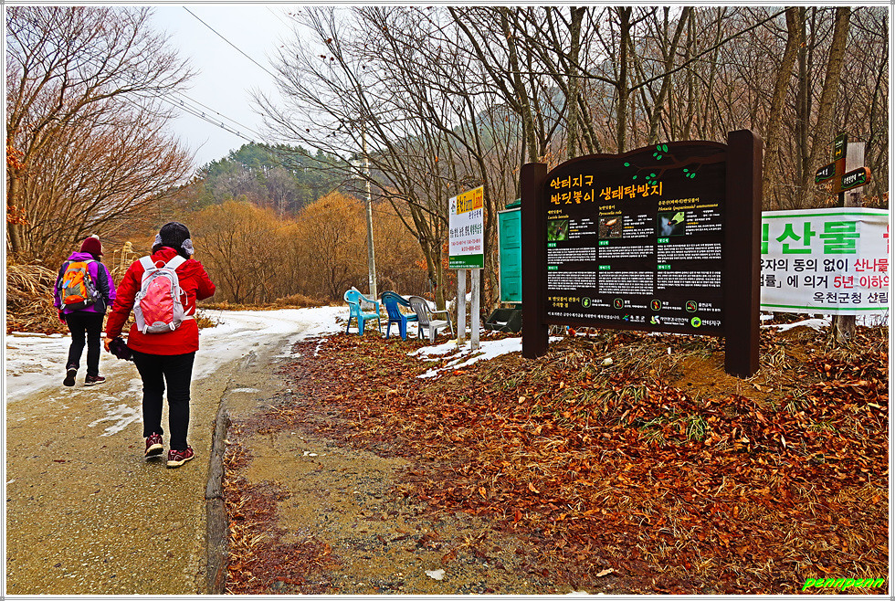 이곳에는 우산초등학교 청마리분교(폐교)를 활용한 옥천옻문화단지 옻배움터가 있으며 바로 이웃에는 금강을 가로지르는 청마교가 있습니다. 오늘 약 11km를 걷는데 3시간 반 정도 소요되었습니다. 사실 임도는 반듯해서 안전하게 걸을 수 있었지만 참 지루했고 보이는 풍경도 무미건조했습니다. 또한 오늘은 이번 겨울철 가장 미세먼지 농도가 높아(매우 나쁨 및 최악단계) 먼 곳의 풍경이 희뿌옇게 보였고 마스크를 쓴 채 걸으려니 숨이 답답했습니다. 낮 최고기온이 영상(섭씨 5도, 단 체감온도 2도)이어서 비교적 포근한 가운데 새해를 맞아 눈을 마음껏 밟아본 것을 자위하면서 등산버스에 오릅니다.