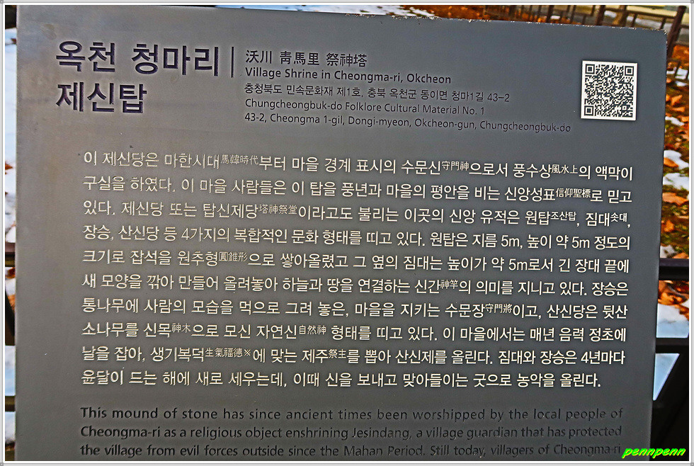 이곳 청마리에는 충북 민속문화재인 옥천 청마리 제신탑이 유명합니다. 원탑(제신탑)은 둥그스름하게 다듬은 돌을 쌓아 세운 탑으로 마한시대부터 마을경계표시나 풍수상의 액막이구실을 하였으며, 마을의 풍년과 안녕을 비는 신앙의 한 형태였습니다. 제신당(제당)으로 불리는 이곳의 신앙 유적은 원탑(제신탑), 솟대, 장승, 산신당 등 4가지의 복합적인 문화형태를 띠고 있습니다.
