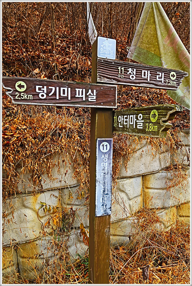오백리길 11구간 “말티고개길”은 석탄리 고인돌공원에서 출발해 청마리 아자학교에 이르는 11km의 도보길입니다. 그런데 이 구간은 처음부터 목적지까지 임도(동이청마임도)로만 조성되어 있어 얼핏 들으면 상당히 쉬울 것 같지만 가장 높은 맡티고개의 해발고도가 410m에 달하므로 결코 만만치 않은 도보길임을 유념해야 합니다.