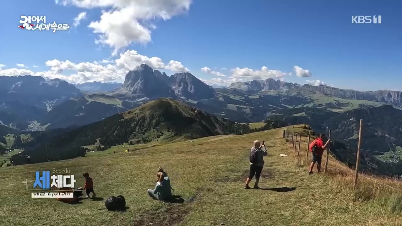 돌로미티의 지상낙원인 세체다는 넓고 푸른 초원과 그 뒤로 뾰족하게 치솟은 산봉우리가 어우러져 그림엽서 같은 풍광을 자랑합니다. 바라보는 시각마다 변하는 세체다의 풍경을 감상하면서 바라보며 망중한을 즐깁니다.