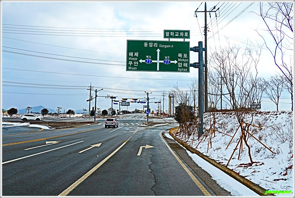 하모리의 두곡교차로에서 77번 국도를 따라 계속 남하한 것은 큰 실수였습니다. 현재 걷는 21코스의 거리는 11.9km에 불과하지만 오늘은 22코스 11.9km까지 동시에 걸을 계획이어서 전체거리가 23.8km에 달하므로 조금이라도 거리를 단축하고자 남쪽으로 진행했는데 자꾸만 21코스에서 멀어진 것입니다. 열매교회를 지나 팔학교차로에서 77번 국도를 다시 만나 직진해 동남쪽 동암리 방면으로 갔으면 좋았을 텐데 두 번째 실수로 남쪽의 목포.압해 방면으로 갔던 것입니다.