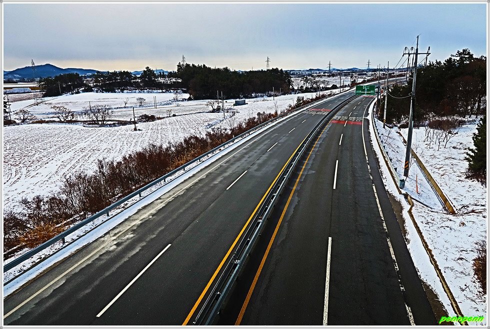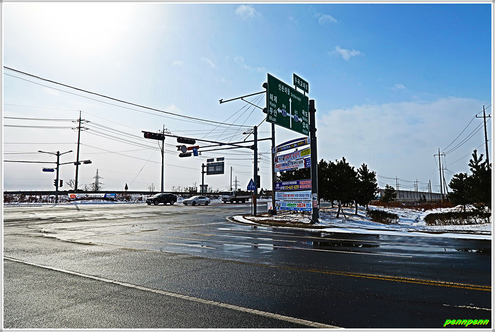 21코스 출발지는 무안군 망운면 손현리 용동마을회관입니다. 2주 전에 보았던 마을회관은 여전히 폐쇄된 상태네요. 서해랑길 21코스 안내지도가 있는 곳에서 남쪽으로 77번국도 옆 (구)도로를 따라 걷습니다. 그간 제법 많은 눈이 내린 듯 논경지는 하얀 눈으로 덮여있는 가운데 동쪽으로는 지난 20코스에서 경유했던 무안국제공항 레이더시설과 공항 관제탑 등이 아련하게 조망됩니다.