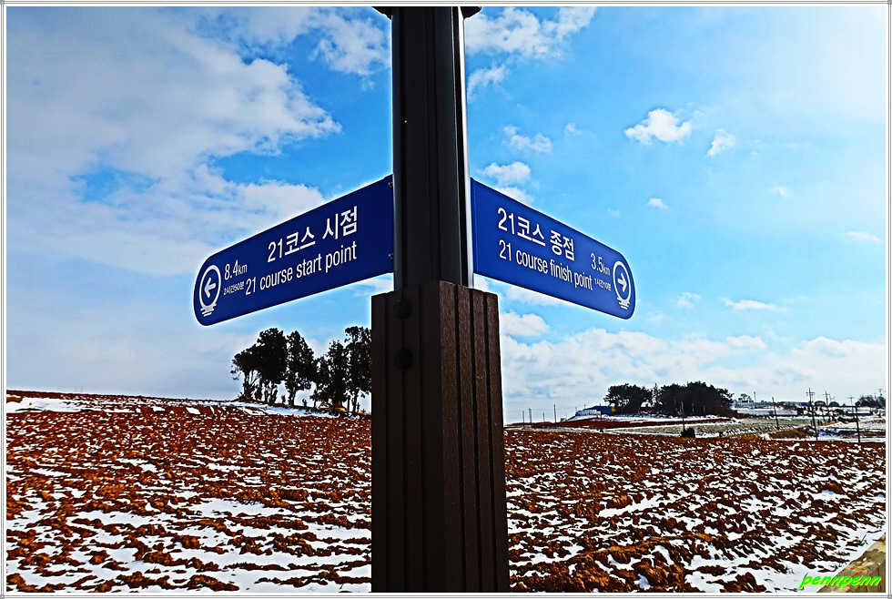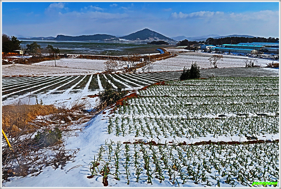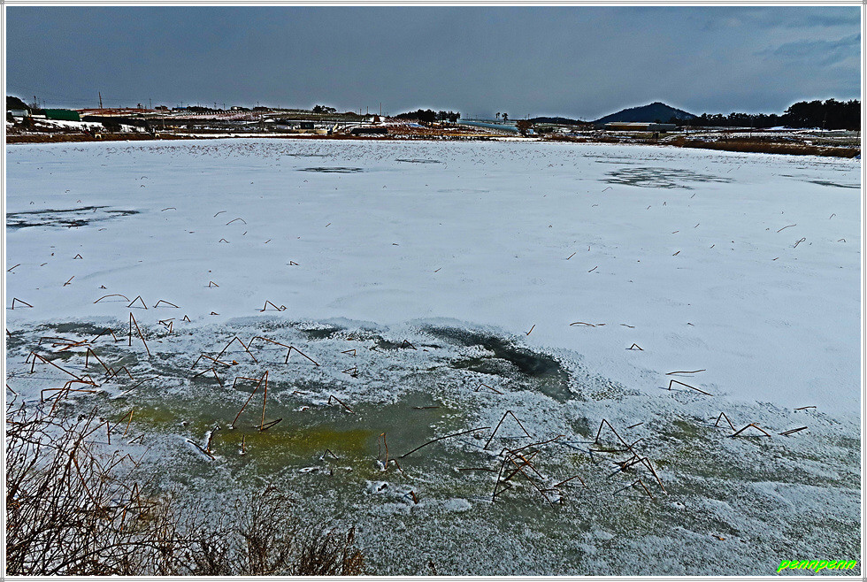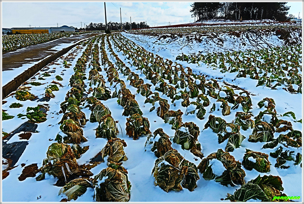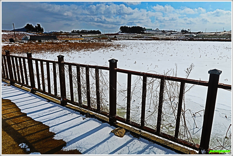 잠시 후 방향이 잘 못 되었음을 확실하게 알아차리고 동남쪽으로 발길을 돌려 우여곡절 끝에 신기저수지 서단에 도착했고 나무데크를 이용해 신기저수지 동단으로 이동해 원래 21코스의 길과 합류해 안도했습니다. 신기저수지는 백련으로 유명하다지만 지금은 백설에 덮여 저수지인지 아닌지 구분이 잘 되지 않습니다. 길섶에는 수확을 하지 않은 배추가 그대로 있는데, 이곳의 배추는 거의 대부분 계약재배라서 이미 주인이 있다는 말을 들었기에 왜 수확을 하지 않았는지 모르겠습니다.