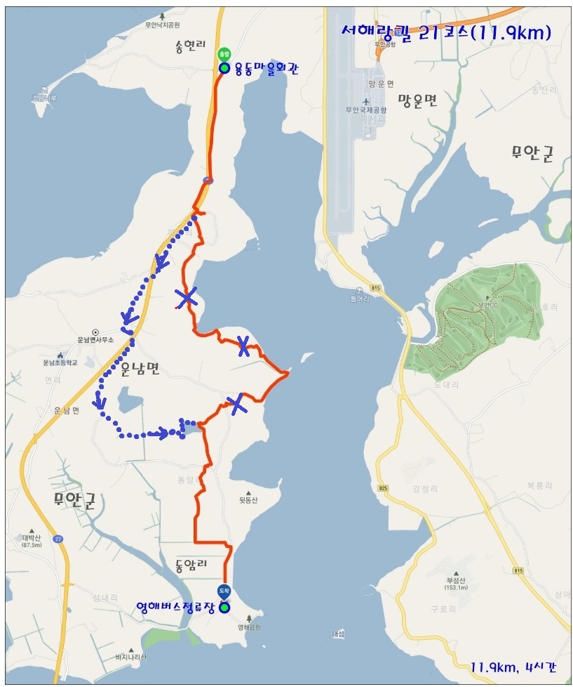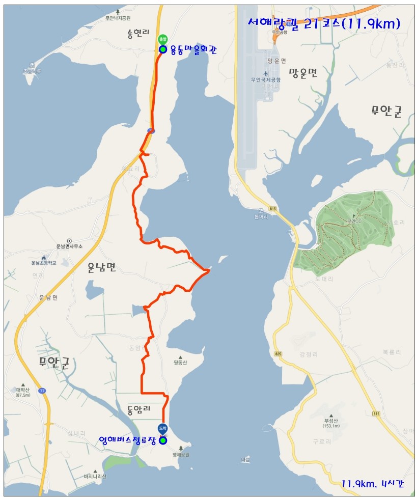 서해랑길 무안 21코스는 망운면 손현리 용동마을회관에서 출발해 신기저수지를 거쳐 운남면 동암리 영해버스정류장에 이르는 11.9km의 도보길입니다. 신기저수지에서는 무안의 특산물인 백련을 만나볼 수 있으며 연꽃이 피는 6~7월이 특히 아름답다는군요.