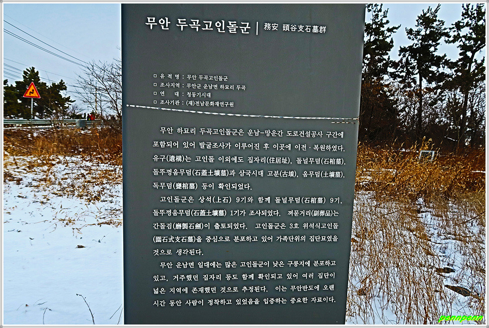 꽃회사 버스정류장에서 77번 국도를 비스듬하게 가로지르는 운남육교를 건너가는데, 육교 위에서 바라보니 무안국제공항의 여객청사도 살포시 보입니다. 지나가는 길목에는 무안두곡고인돌군이 있군요. 고인돌은 청동기시대 무덤양식으로 우리나라에서 고인돌이 가장 많이 분포한 지역은 인천 강화도와 전북 고창 및 전남 화순인데 이곳 무안에도 고인돌이 있음을 처음 알게 되었습니다. 이곳은 운남-망운간 도로공사구간에 산재해 있던 고인돌을 이전해 복원한 것이랍니다. 다만 고인돌주변에는 잡풀이 무성해 전혀 사후관리가 안 되어 있는 모습이어서 안타깝더군요.