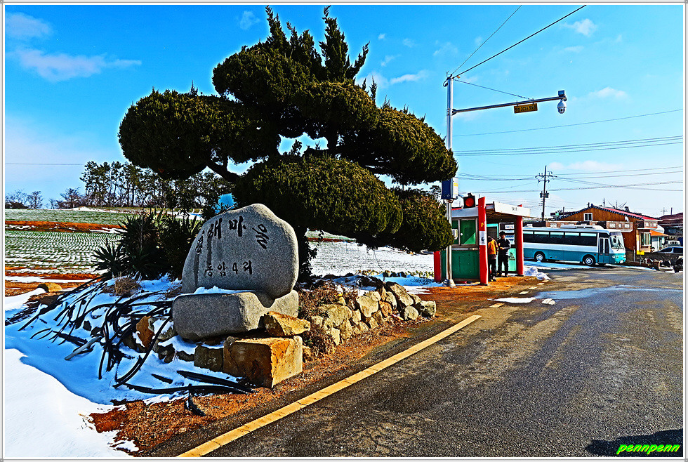 죽산마을표석을 지나 차도를 이탈해 우측 농업용 도로로 들어섭니다. 주변은 온통 양파재배단지입니다. 무안은 전국 최상의 양파생산지인데, 무안양파는 해풍을 쐬며 자라기 때문에 맛과 향이 독특하고 무안의 비옥한 황토밭에서 재배돼 성인병 예방과 항암작용에 효능을 지닌 셀레늄 함량이 풍부하기 때문이랍니다. 다시 차도로 나와 조금 걸어가니 목적지인 동암리 영해마을버스정류장입니다.