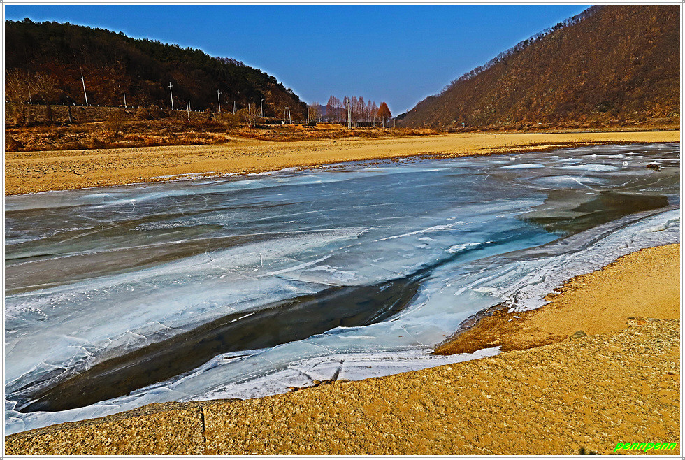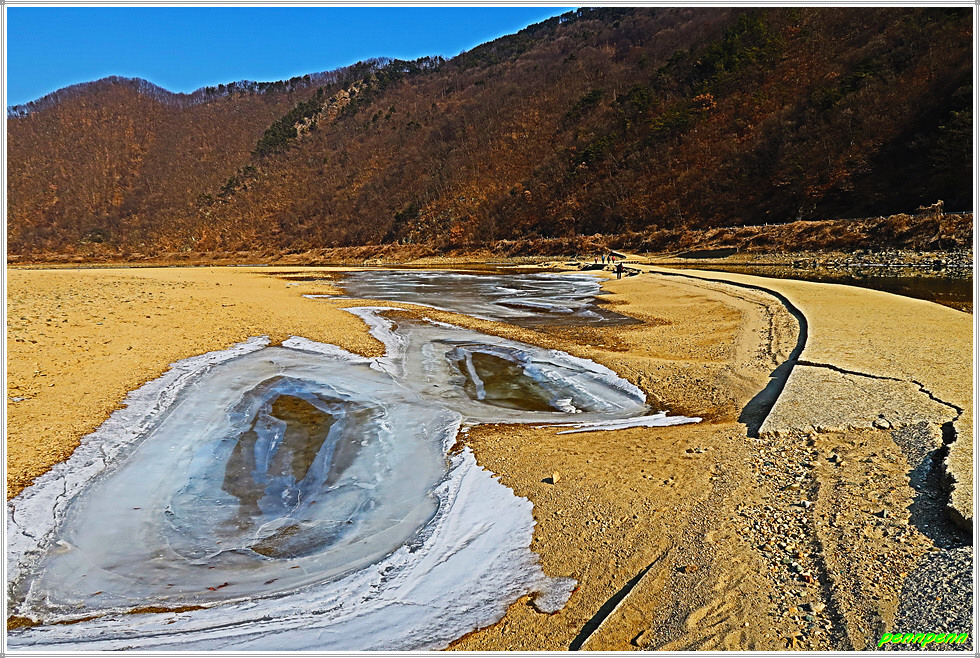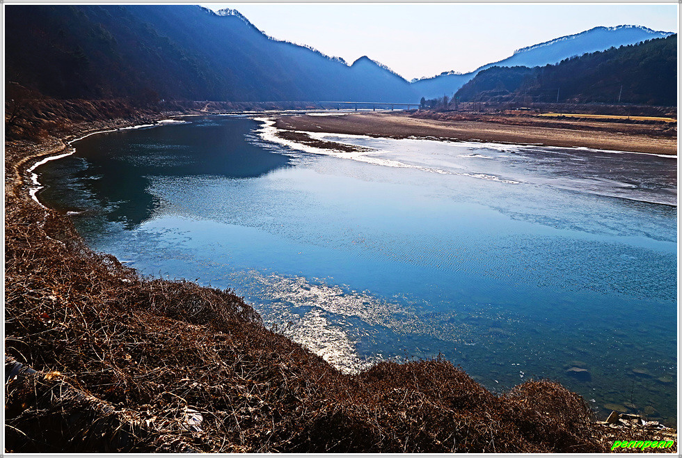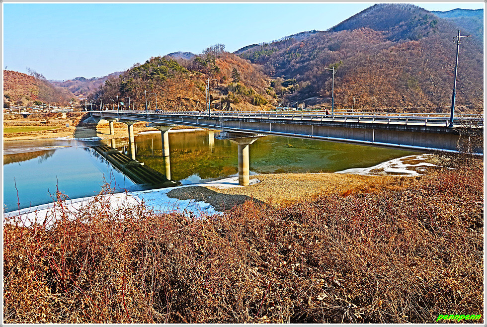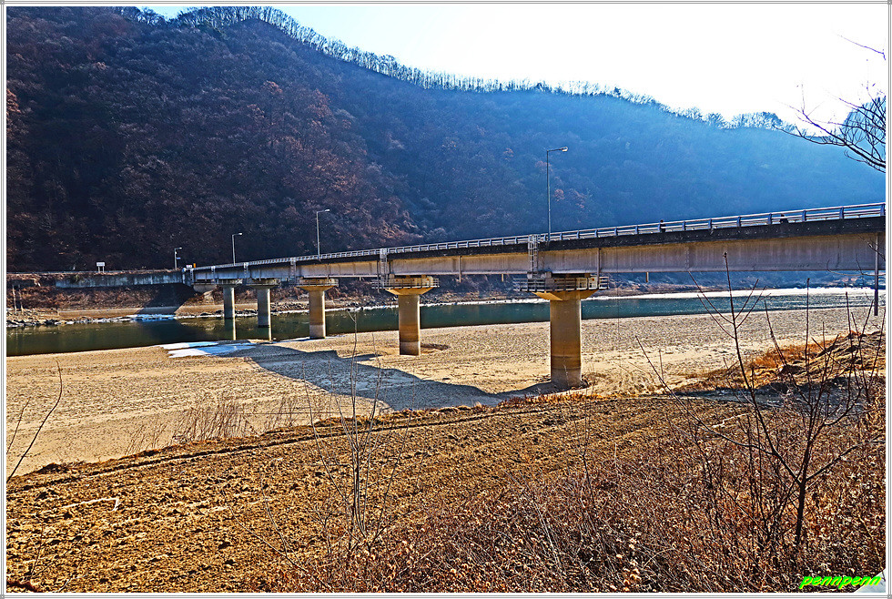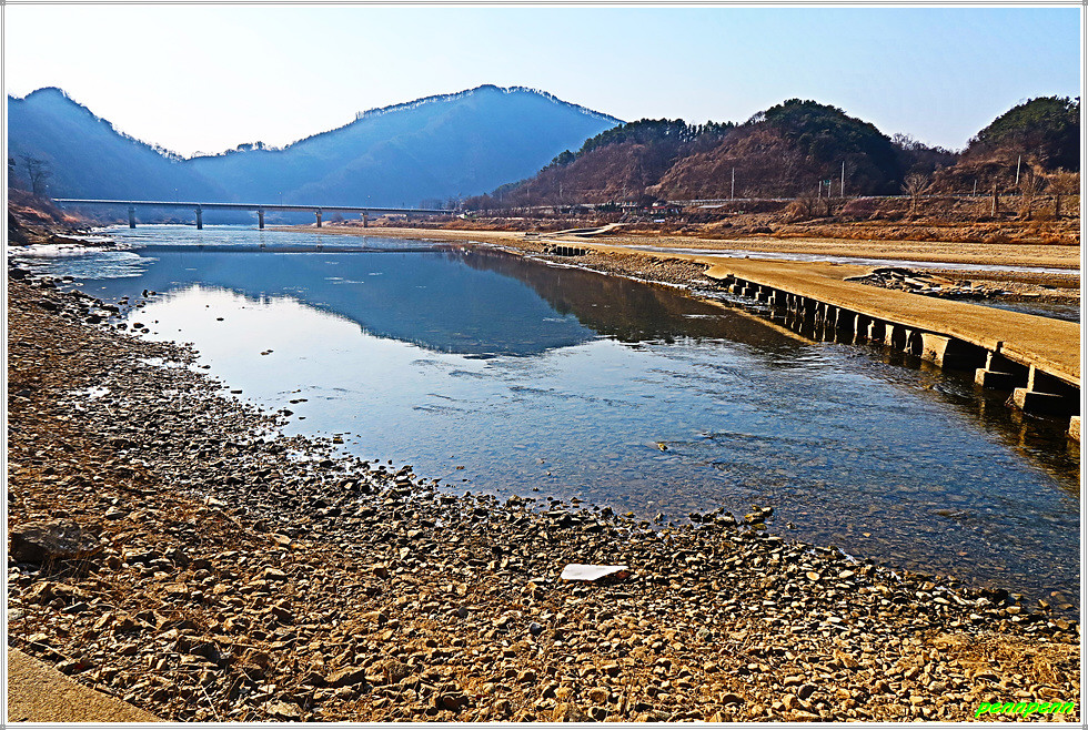 575번 지방도로를 따라 남하한 후 청마1교차로에서 가덕교를 건너지 않고 가덕교 서단에서좌측 아래로 내려서서 강변길을 걸어가 금강바닥의 잠수교를 건너는게 걷기의 포인트입니다. 물론 우기에는 이 길을 이용할 수 없겠지요. 물이 고인 금강바닥은 빙판으로 변해 있고 물이 흐르는 곳은 얼음이 얼지 않아 산의 반영을 잘 볼 수 있어 정말 풍광이 멋집니다.