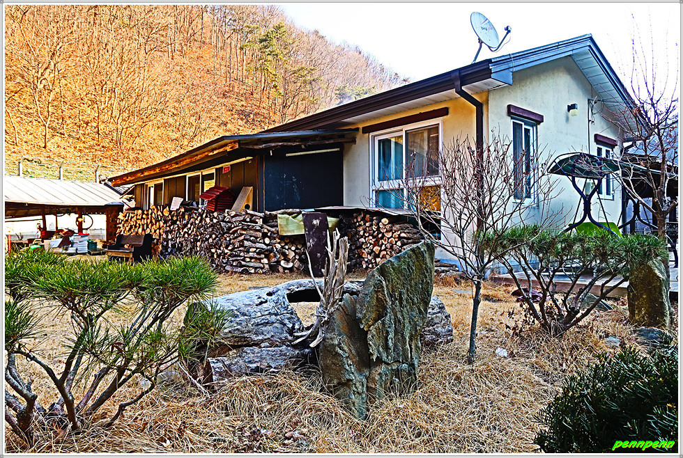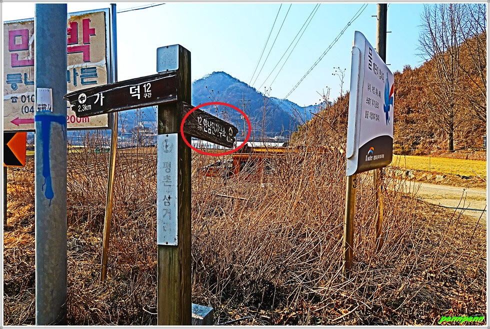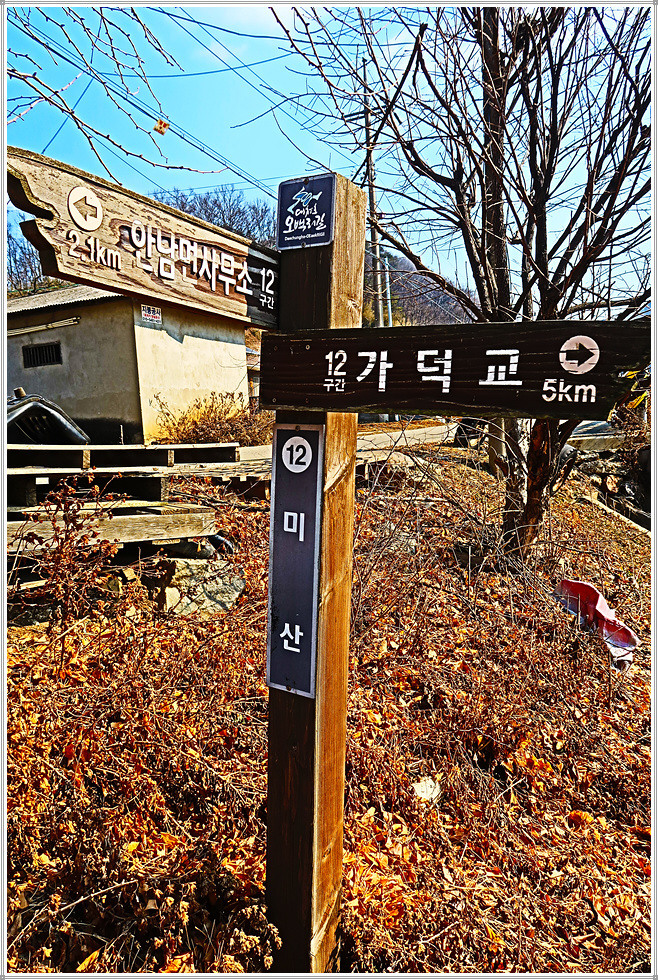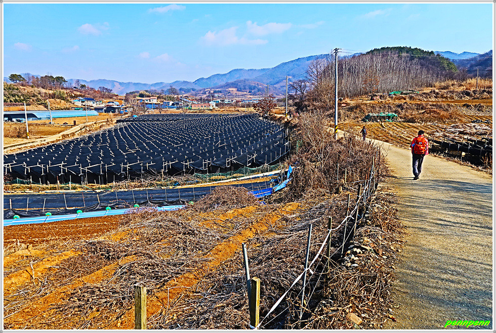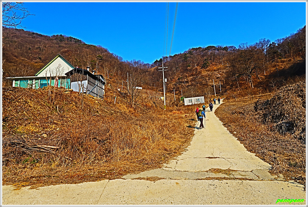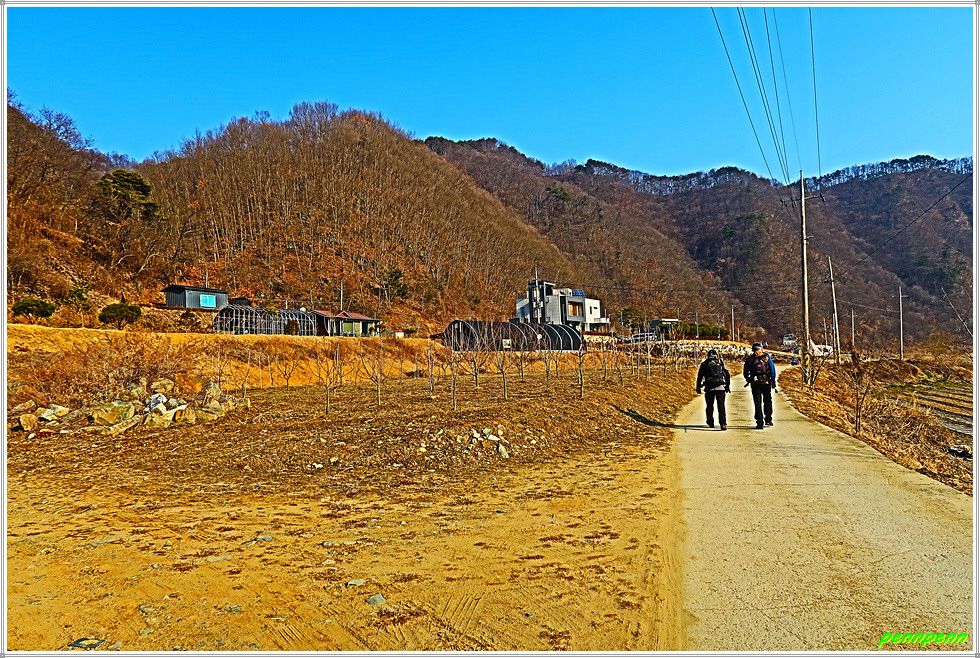 해발 277m의 고갯마루를 넘으면 이제부터는 계속 내리막입니다. 고개를 넘어 비포장 임도를 따라 걷는데 길섶에는 사람이 사는 흔적이 거의 보이지 않는 외딴 민가가 가끔씩 나타납니다. 청동골을 요리조리 돌아 규모가 큰 주택 옆으로 지나가는데 응달에는 녹지 않는 눈이 그대로 길을 덮고 있어 겨울분위기가 물씬 풍깁니다.