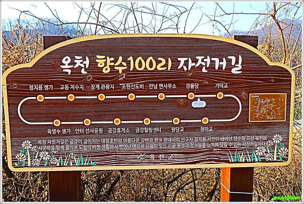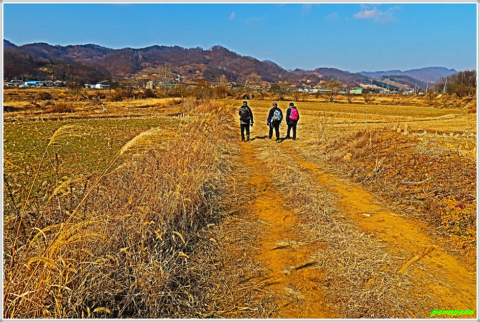 오늘 약 15km를 걷는데 4시간이 걸렸습니다. 중국발 미세먼지의 유입으로 우리나라는 전국적으로 대기의 질이 매우 나쁨 수준이었지만 다행히 옥천지방은 보통수준이어서 마스크를 벗고 걸을 수 있었습니다. 트레킹을 시작한 후 해발 277m의 고개를 넘을 때는 다소 다리가 무거웠지만 금강변을 걸으며 맞이한 아름다운 겨울풍경에 매료되었습니다. 특히 지나는 길손에게 따끈한 음료수를 제공해 준 대전거주 주말농장부부의 따뜻한 마음씨는 쌀쌀한 강바람을 훈풍으로 바꾼 미담으로 기억될 것입니다.