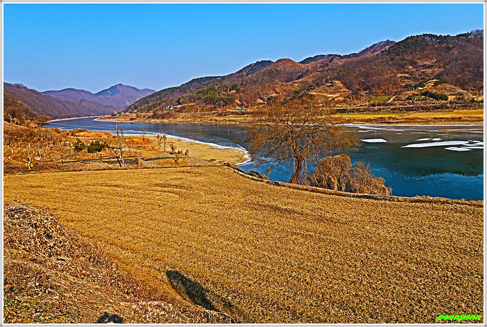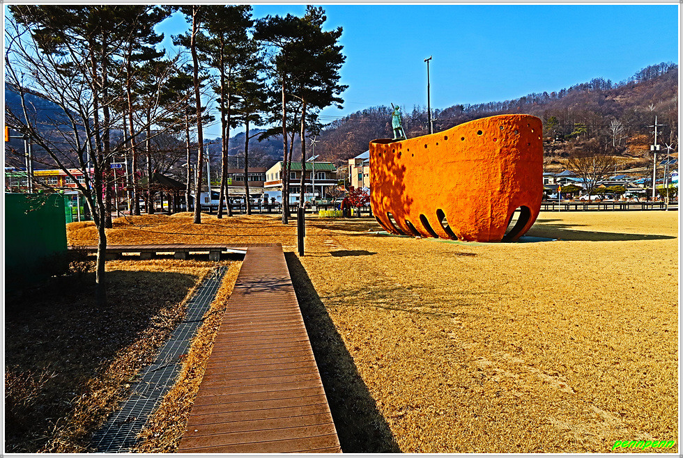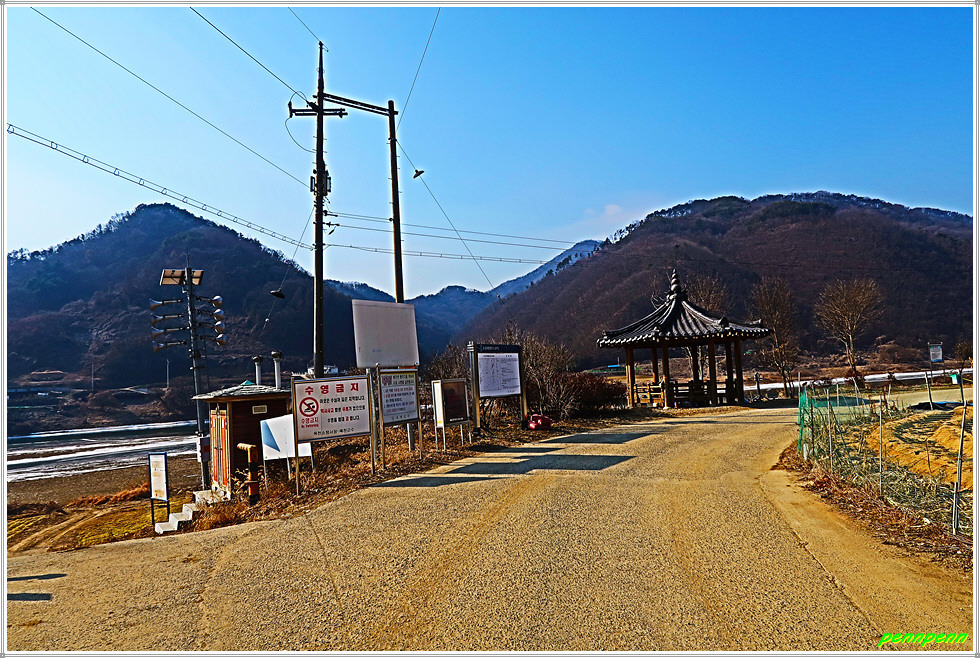 강변에는 정자도 있고 향수100리길 이정표 및 1박2일 촬영지였다는 안내문도 보입니다. 가축용 초지밭은 어느새 파릇파릇 봄의 온기를 머금은 모습입니다. 지나가는 길목에 소방헬기 조형물을 세워둔 게 매우 이색적이네요. 바로 이웃에는 카페처럼 생긴 가게가 보여 일행 중 M씨가 커피가 있는지 물었습니다. 주인 여성이 있다고 대답해 우리일행(4명)은 가게로 갑니다. 한잔에 얼마인지 물어보니 커피를 파는 가게가 아니라고 하기에 우리는 실례했다며 나가려고 하니 주인은 커피와 음료수를 마시고 가라고 강권합니다. 바로 옆 자동차에는 남성이 있는데 이야기를 듣고 보니 이들은 대전에 사는 부부로 주말이 되면 이곳으로 와 농장도 돌보면서 공기 좋은 자연 속에 하룻밤 쉬어간다고 합니다. 강바람이 부는 쌀쌀한 날씨에 마음씨 좋은 부부를 만나 따끈한 음료수 한잔을 공짜로 대접받고 보니 발걸음이 한결 가벼워집니다.