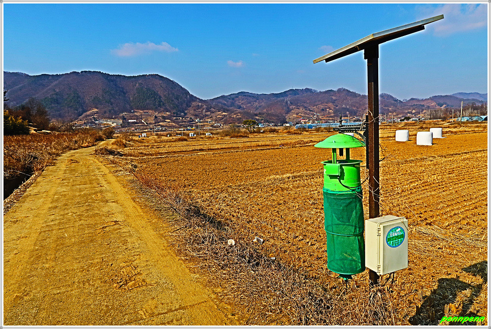 금강수변생태벨트를 지나갑니다. 종미리 종배마을회관을 뒤로하고 아랫종배마을을 지나면 작은 언덕 위 거목 옆에 그림 같은 정자가 세워져 있습니다. 농경지에 세워둔 해충퇴치용 기구가 눈길을 끕니다. 이제 안남면 소재지가 보이기 시작하는군요. 안남천에 걸린 연주교를 건너면 연주공원의 명물인 둥실둥실배바우 조형물이 보이고, 바로 이웃에는 목적지인 안남면사무소입니다. 사무소 앞에는 옥천 1경인 둔주봉에서 본 한반도지형 사진이 걸려 있네요.