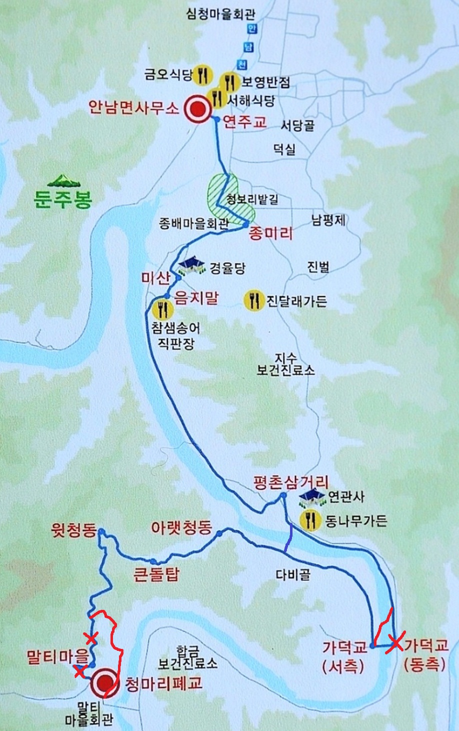 ▲ 코스 : 청마리 세신탑-옥천마티공동생활관-고갯마루-청동골-청마대교(남단)-가덕교(서단)-잠수교-청마대교(북단)-평촌삼거리-정자-소방헬기조형물-경율당-종배마을회관-연주교-연주공원-안남면사무소