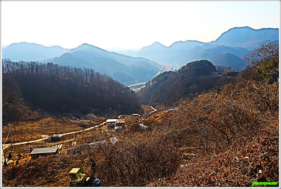 옥천마티공동생활관이 있는 곳에서 좌측의 후묵골로 들어섭니다. 완만한 경사의 세멘트포장도로가 이어집니다. 점점 고도를 높이며 좌측으로 방향을 전환한 후 내려다보니 지나온 후묵골과 이름 모를 산봉우리 사이로 금강이 살포시 보입니다. 계속해서 고도를 높이니 출발점의 청마교가 그 모습을 드러냅니다.