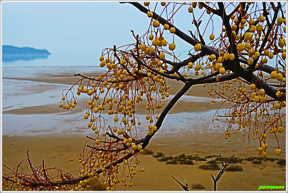 외덕마을을 지나면 해안길은 북쪽으로 방향을 바꿉니다. 바닷가 모래톱에는 검은 머리에 백색바탕의 철새가 무리를 지어 앉아 있는데 현지인에게 물어봐도 새의 이름을 알 수가 없습니다. 얼핏 우리가 흔히 보는 까치처럼 느껴지네요. 열매를 주렁주렁 매달고 있는 멀구슬나무를 보면 자동적으로 카메라를 들이대게 됩니다.