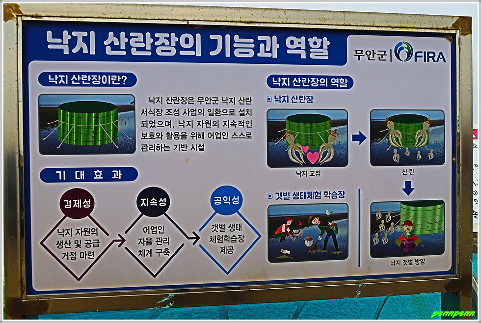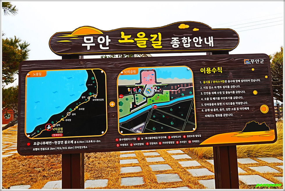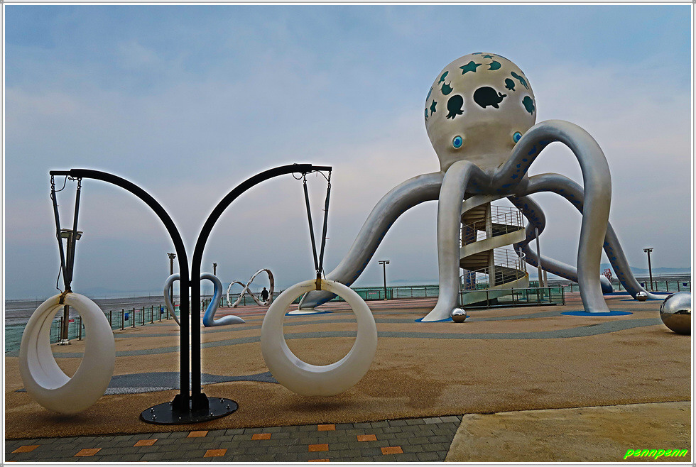 드디어 조금나루 해변에 이어 이번 코스의 두 번째 하이라이트인 낙지공원입니다. 무안군 망운면 송현리 소재 무안 낙지공원은 개펄내음이 물씬 풍기는 조금나루 해변 앞에 무안의 특산물인 낙지를 알리고자 조성된 캠핑공원으로 노을길 야영장을 운영하고 있습니다. 이곳에는 낙지모형의 무인카페, 거대한 낙지조형물(전망대)이 있어 여행객들이 쉬어가는 명소입니다.
