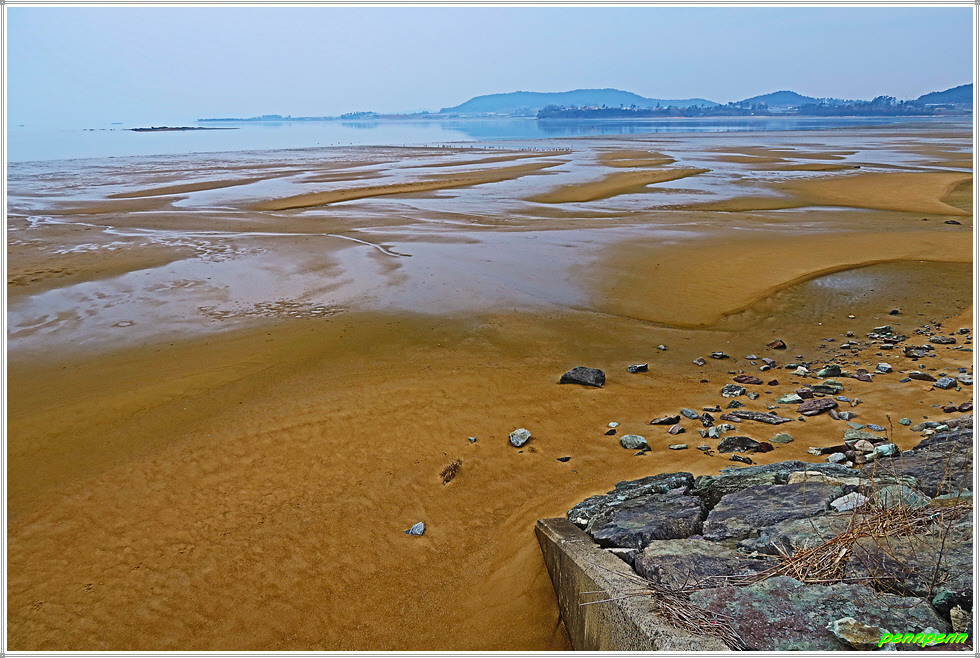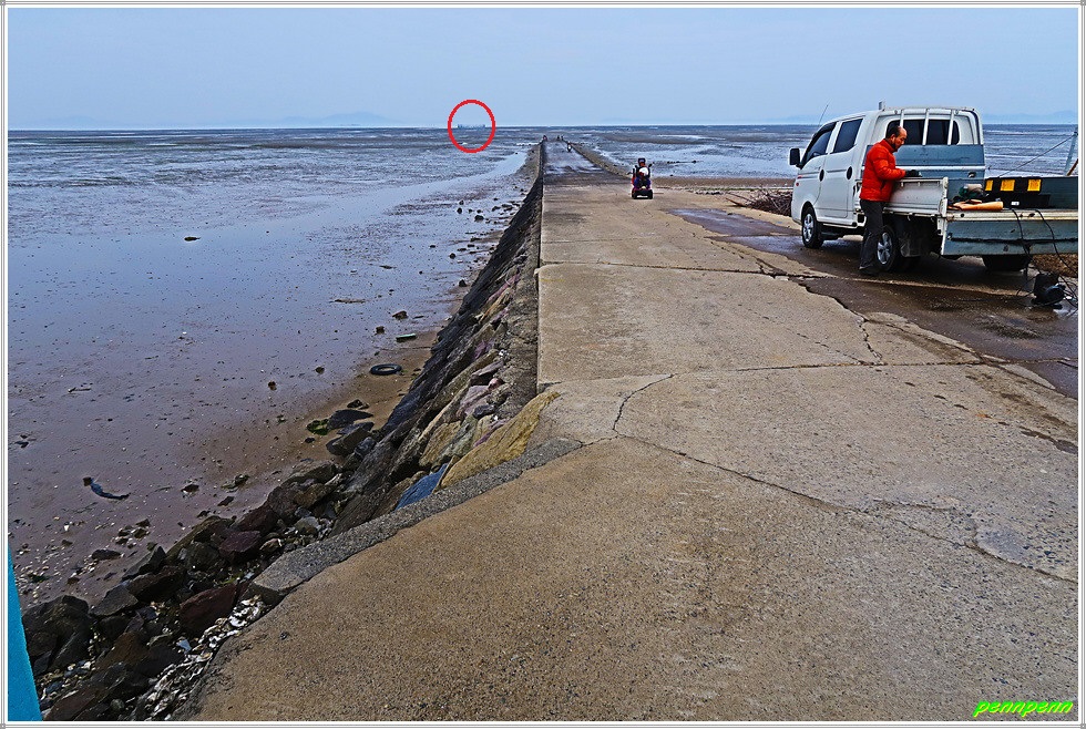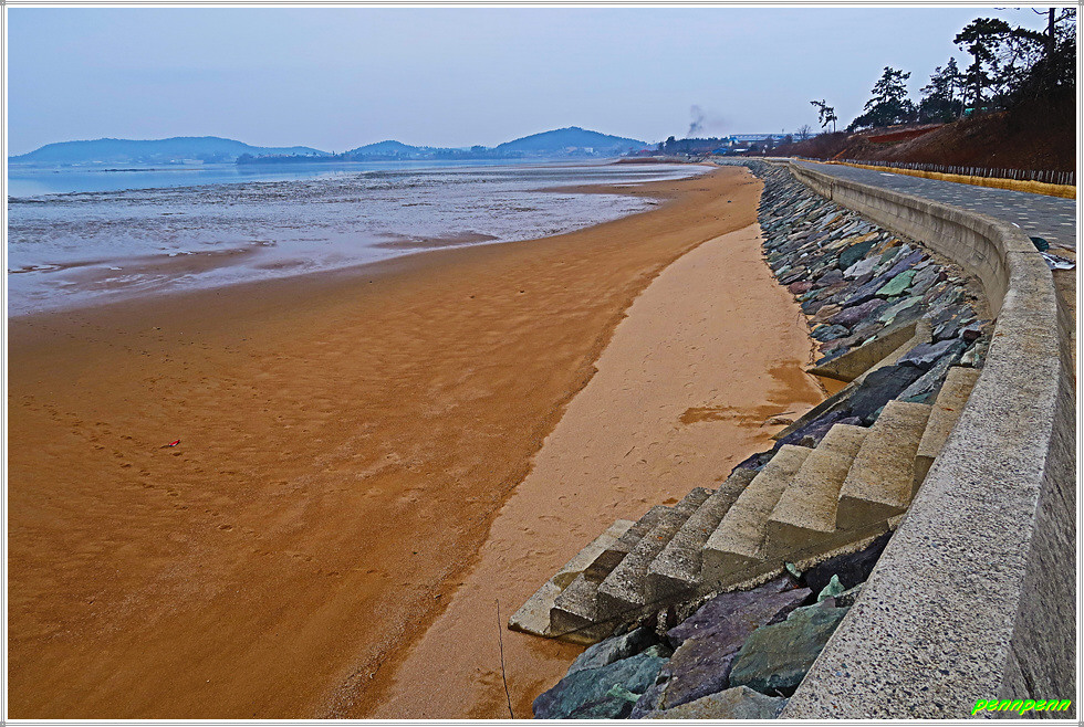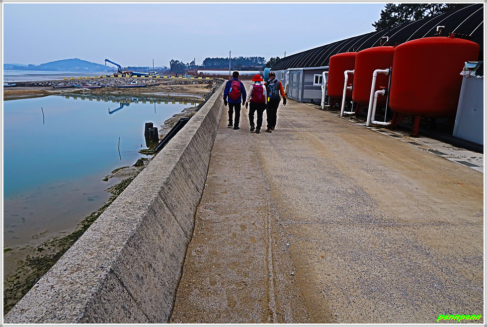 저동마을회관에서 우측으로 방향을 돌려 걷는데 비닐하우스에서는 세발나물이 자라는 모습이 마치 잔디를 보는 듯합니다. 농업용 도로를 돌아 북쪽으로 진행하면서 바닷가의 방조제길을 만나 우측으로 갑니다. 짙은 미세먼지와 흐린 날씨로 인해 모두가 희뿌옇게 보여 참으로 안타깝습니다. 바닷가는 썰물이어서 갯벌이 드러나 있는데 이곳은 조개류, 갯지렁이, 굴, 낙지 등의 공동허가지역이라고 하는군요.