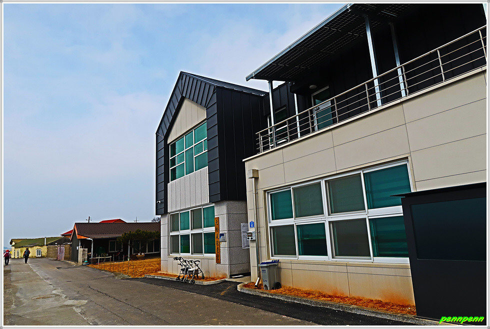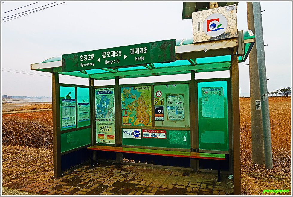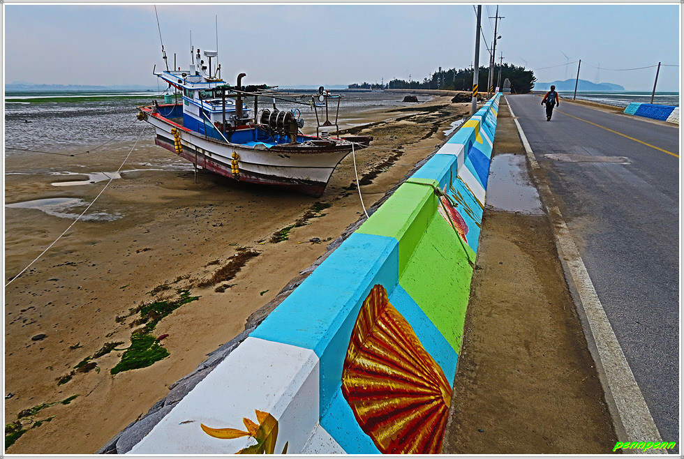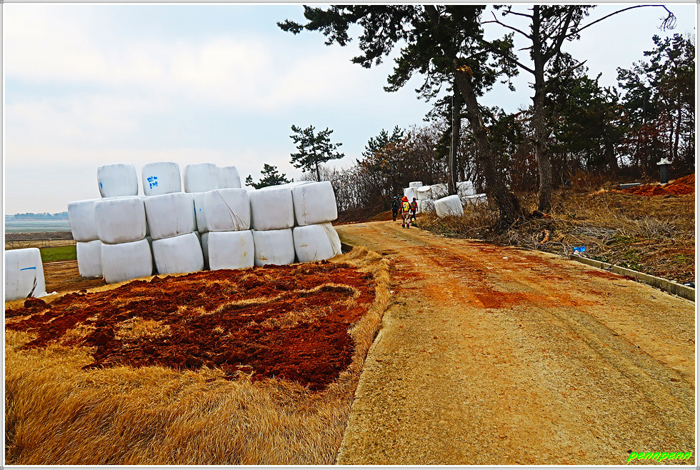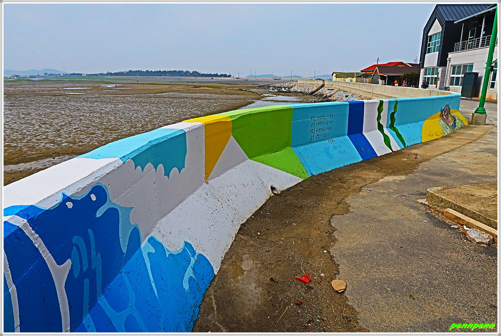 가축사료용 건초더미가 많이 쌓여 있는 곳은 어김없이 축사입니다. 송림군락지를 지나 양파밭너머 멋지게 보이는 큰나무 몇 그루가 눈에 들어오는군요. 송현마을회관을 지나면 다시 바닷가인데 정자가 있어 길손의 다리품을 쉬기에 안성맞춤입니다. 해안방조제에는 벽화를 그려 놓았군요. 원송현경노당은 지금까지 만난 어촌마을의 다목적센터 중에서는 가장 최신식 건축물일 것입니다.