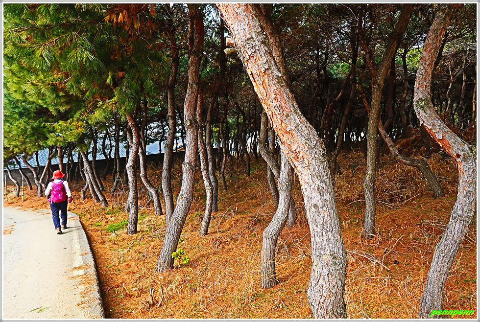이제부터는 해변을 따라 북동쪽으로 발걸음을 옮깁니다. 길목에는 송현항 조금나루 관광안내도와 낙지산란장의 기능과 역할에 대한 안내문이 세워져 있는데, 바다 쪽에 보이는 원통형의 시설물이 낙지산란장임을 처음 알게 되었습니다. 길목의 이정표를 보니 목적지까지는 8.9km를 더 가야 하네요. 작은 언덕 위에는 마치 풍치림처럼 보기 좋은 나무군락지가 있습니다.
