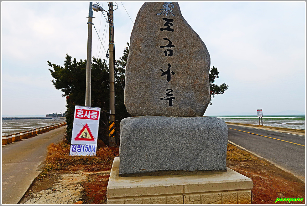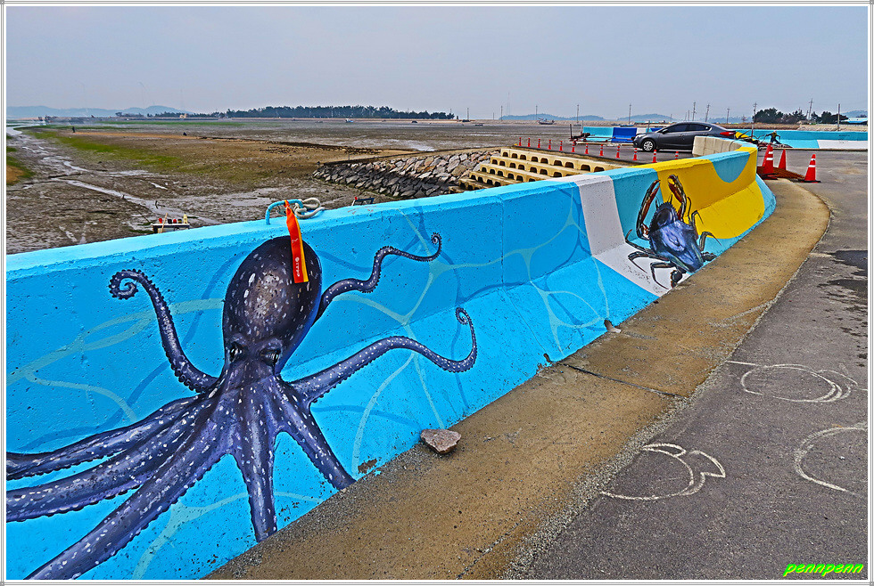 여기서 조금나루 입구까지 가는 길은 송현마을 벽화거리로 낙지 등 해산물 벽화, 썰물로 인해 드러난 넓은 갯벌, 방조제에 매어 둔 선박 등 전형적인 어촌마을의 풍경을 보여주고 있습니다. 삼거리갈림길에서 좌측으로 조금 가면 조금나루해변 표석이 이방인을 맞아주는데, 원래 서해랑길 23코스는 여기서 조금나무해변을 한 바퀴 돌아 나오는 것이지만 오늘 전체 거리가 19.5km에 달해 약 1km의 거리라도 단축하고자 여기서 바로 낙지공원 방면으로 발길을 돌립니다.