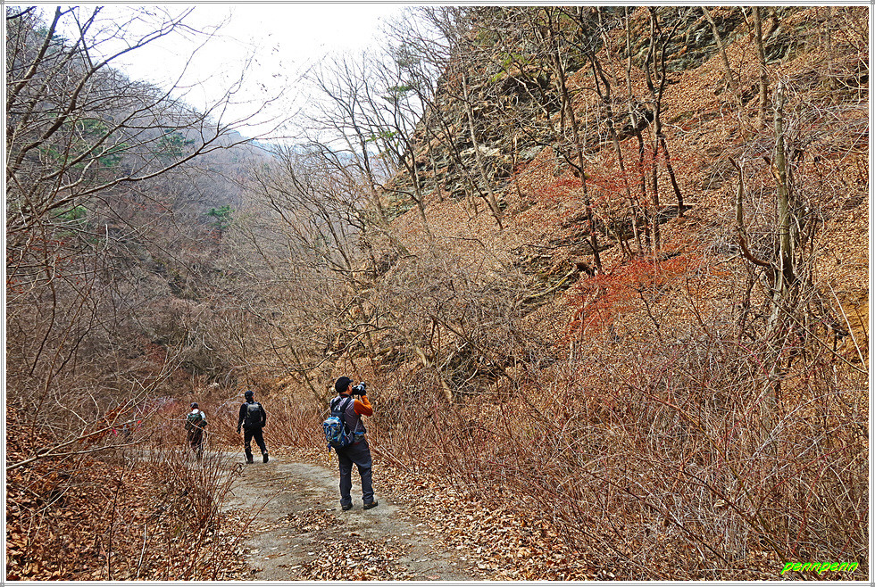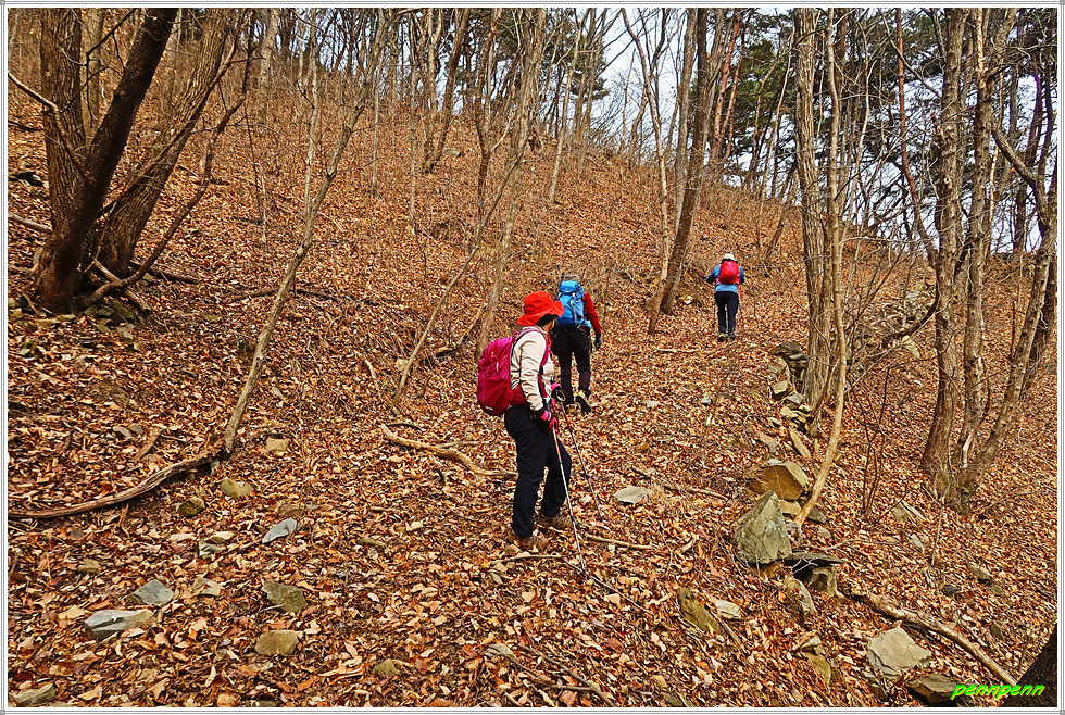 임도가 좌측으로 구부러지는 곳에서 임도를 버리고 좌측 숲으로 진입합니다. 잠시 희미한 길을 헤쳐 나가면서 석축이 있는 길을 지나 다시 좌측으로 몸을 돌려세웁니다. 이어지는 길은 상당히 희미하군요. 선두 대장이 먼저 가면서 길이 이어지는 곳을 잘 표시해 놓았고 가끔 보이는 선답자들의 리본도 크게 도움이 됩니다.