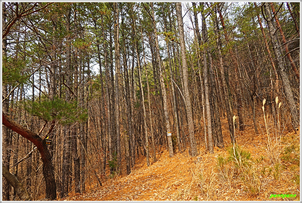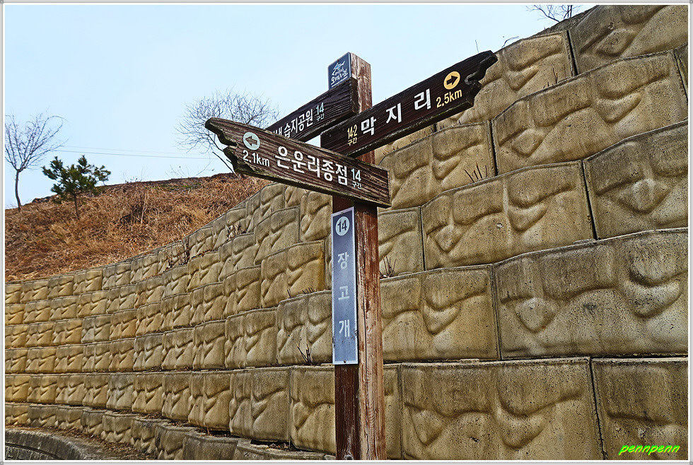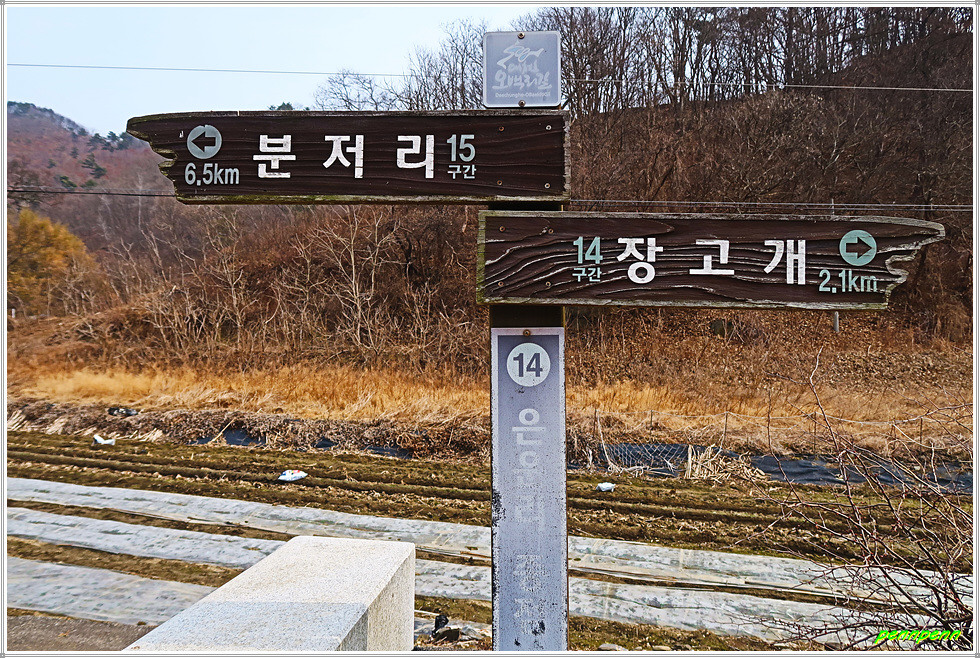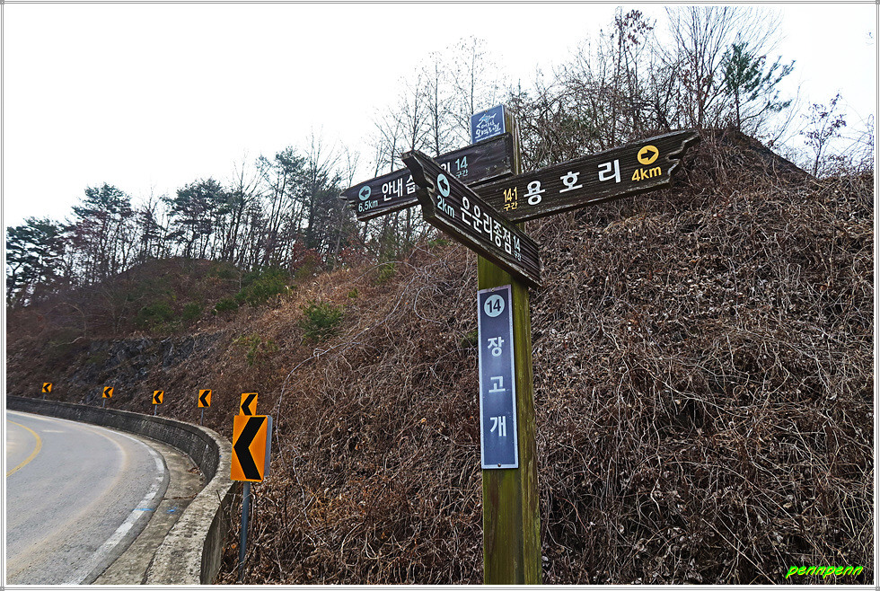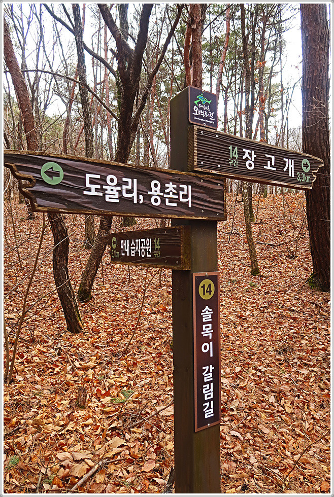 화골갈림길을 지나갑니다. 그러고 보면 방금 지나온 산협(山峽)이 화골인지 잘 모르겠군요. 늘푸른숲을 뒤로하고 침엽수림지대를 지나면 장고개입니다. 장고개는 14구간의 이름(장고개구불길)이 지어진 고개로군요. 여기서 목적지인 은운리까지는 2.1km 남았습니다. 첫 번째 만난 장고개 이정표에서 약 100m 아래쪽에 두 번째 장고개이정표가 있군요.