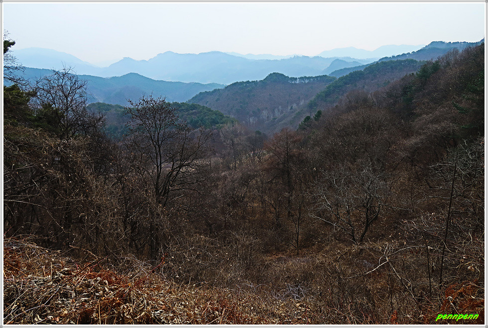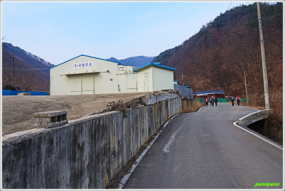 신촌마을버스 정류장에서 좌측으로 진입합니다. 특이하게 생긴 굴뚝도 있고, 주류를 제조하는 농업회사법인인 국향주조(주)도 보입니다. 탑살이골을 들어가노라면 탑산이인데, 여기서 오백리길은 우측의 임도로 오르게 됩니다. 임도를 걸으면 가끔 우측으로 조망이 터지기는 하지만 오늘은 미세먼지가 매우 나쁨 수준이어서 시계는 상당히 뿌옇습니다.
