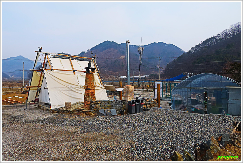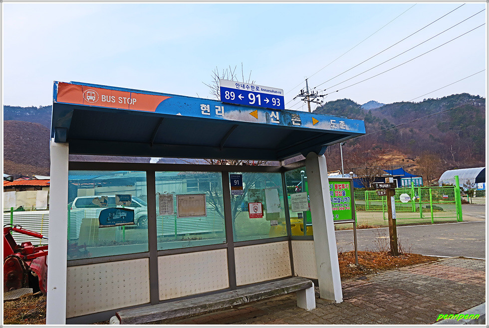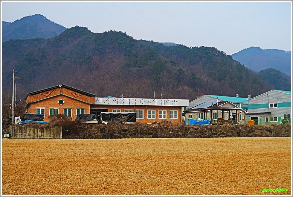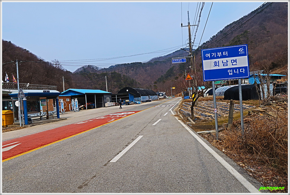진행방향의 왼쪽에는 신촌한울마을 다목적체험관이 있는데, 안내면 현리 소재 신촌한울마을에는 각종 농촌체험을 할 수 있는 시스템을 마련해 놓았습니다. 이곳은 감자 캐기, 옹기 흙목걸이 만들기, 김장 담그기, 사과 따기, 개구리알 관찰하기 등이 준비되어 있으며 행정안전부가 지정한 정보화 마을로서 주민들이 생산한 특산품을 인터넷으로 판매하기도 한답니다. 이곳 신촌마을은 공장이 많은 것 같습니다.
