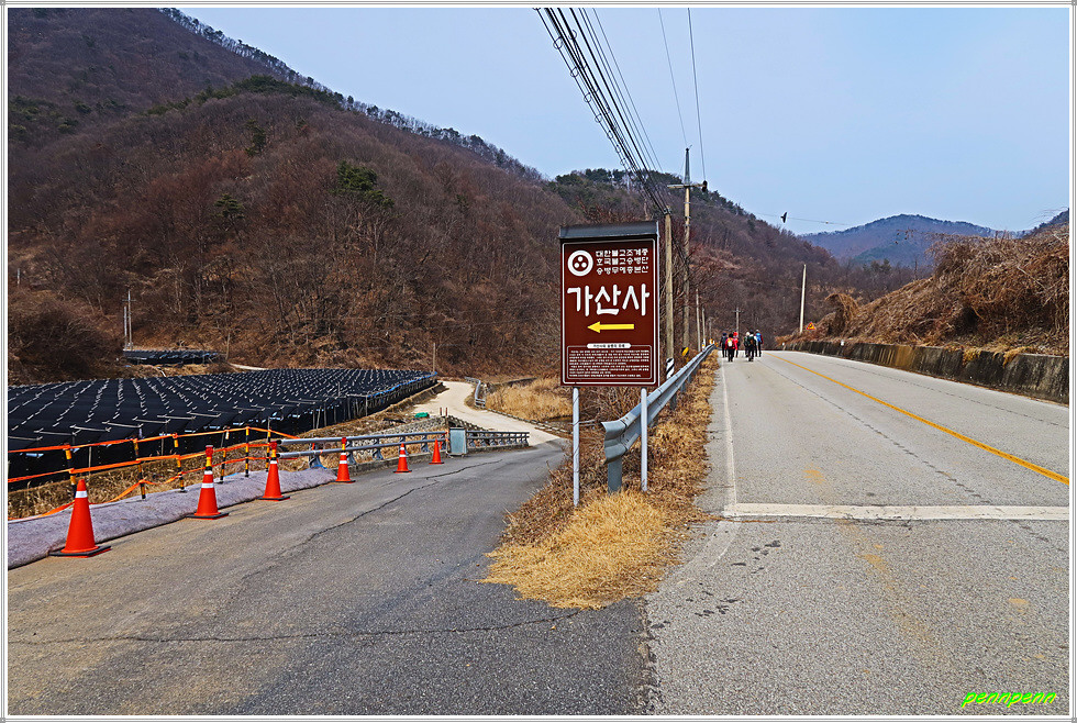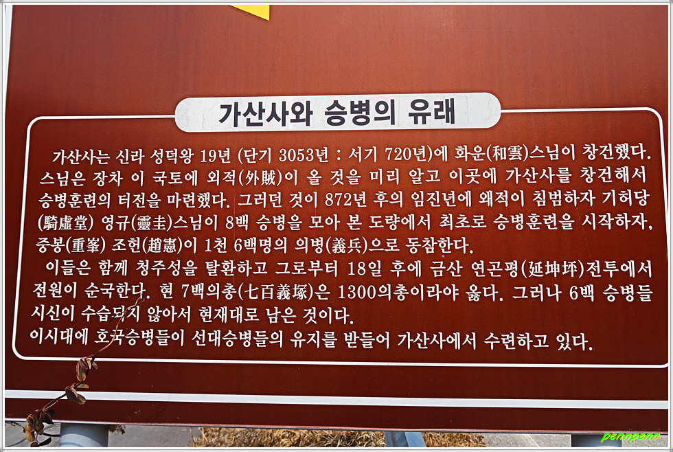 이제부터 차도는 북쪽으로 이어집니다. 담양리마을을 뒤로하고 502번 지방도로를 만나 좌측 양지교를 건넙니다. 도로 좌측 골짜기에 가산사가 있다는 안내문이 있습니다. 가산사는 전혀 알려지지 않은 사찰인데 현지 안내문을 보니 대한불교조계종 호국불교승병단 승병무예총본산이라고 합니다. 가산사는 신라 성덕왕 19년(720)에 화운스님이 창건한 천년고찰로 임진왜란이 발발하자 의병장 영규스님이 800 승병을 모아 훈련시켰고, 중봉 조헌 선생이 1,600명 의병으로 동참한 역사적인 곳입니다.