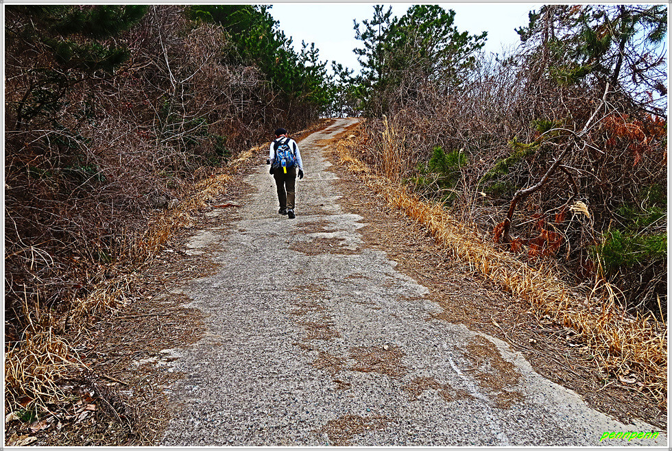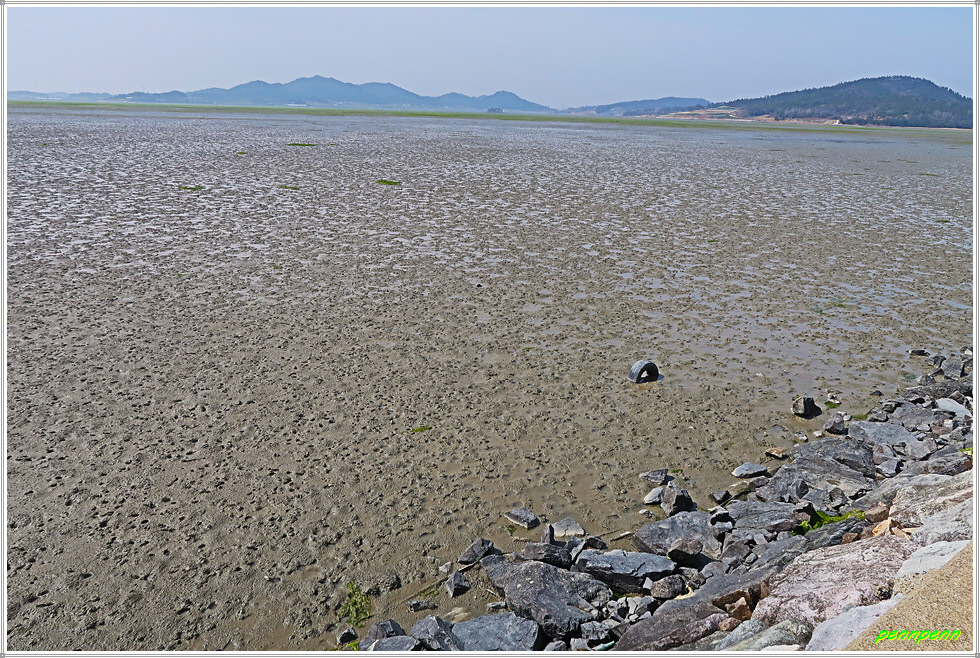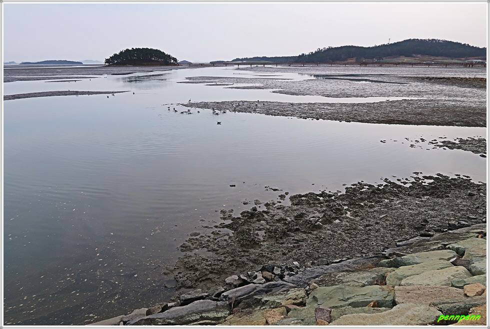 좌측으로는 봉황산(166m)과 선황산(114m), 우측으로는 선봉산(122m) 사이로 조성된 임도를 걸으며 고갯마루(매봉재?)를 넘어 차도와 만나게 되고 오른쪽인 북쪽으로 가면 다시 바닷가 방조제가 나옵니다. 송강레미콘 공장에서 북서쪽으로 방향을 돌려 끝없이 펼쳐진 갯벌을 봅니다. 가까운 갯벌의 모래톱에는 갈매기들이 휴식을 취하고 있군요. 모래톱 뒤로는 잠시 후 가야할 거북섬이 해상테크로드로 연결된 모습입니다.