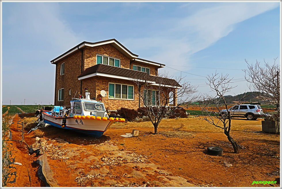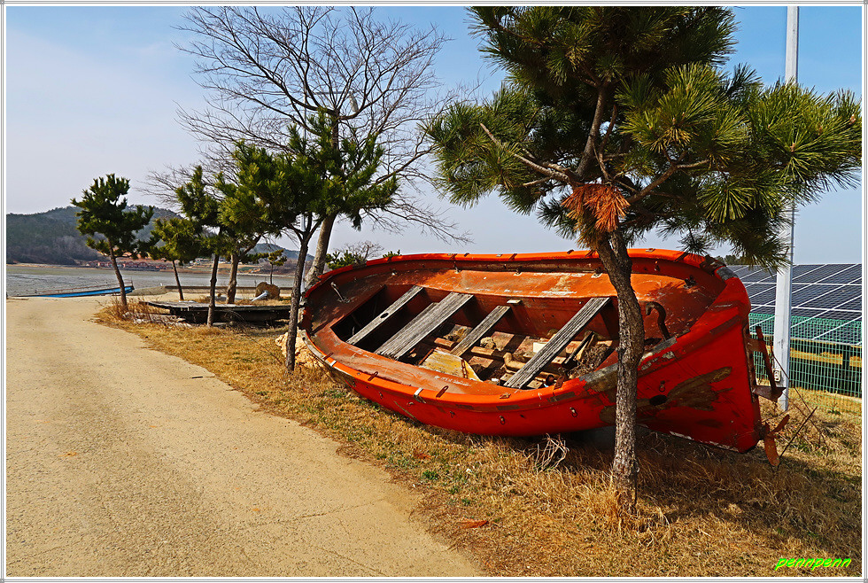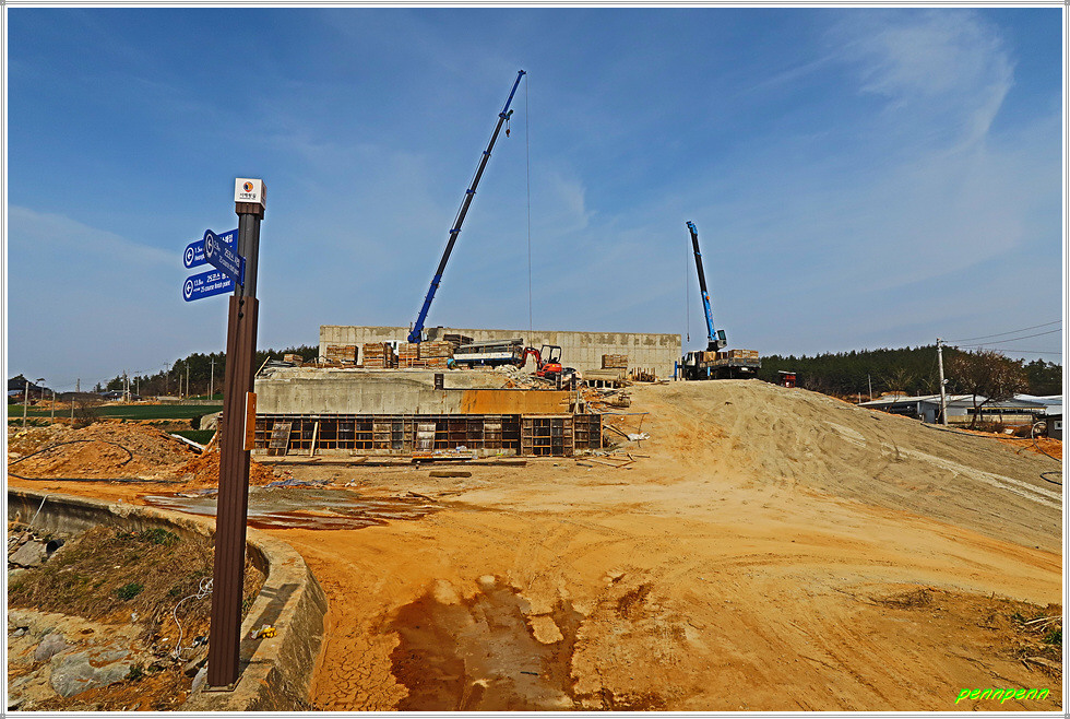 매안마을회관을 지나면 다시 방조인데 이제부터 길은 계속 갯벌이 보이는 바닷가로 이어집니다. 어촌마을답게 선박 1척이 주택 앞뜰에 놓여 있군요. 현재시각은 정오, 썰물 때여서 바닷가는 갯벌을 훤히 드러내 놓고 있습니다. 바닷가 모퉁이에는 큰 공사가 진행 중이네요.