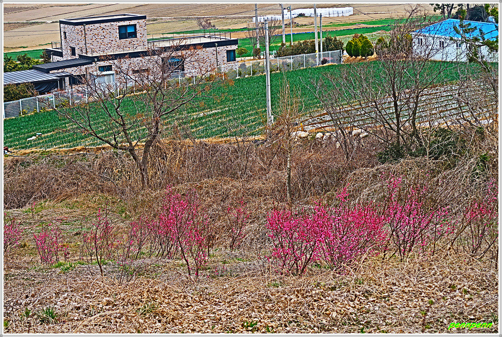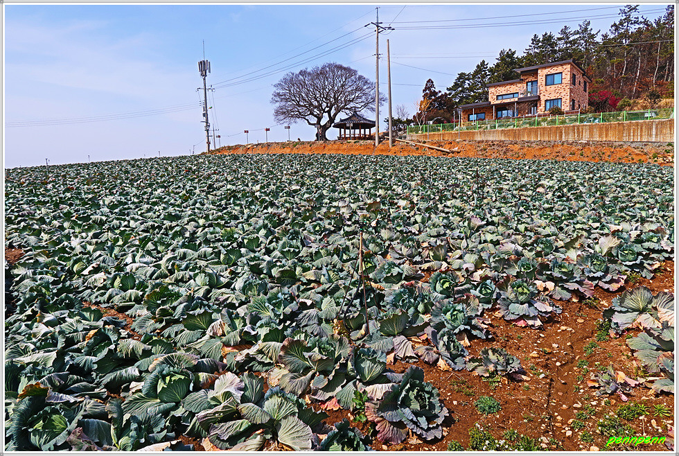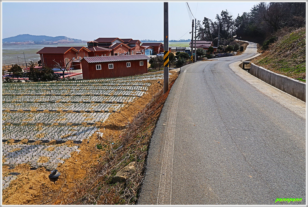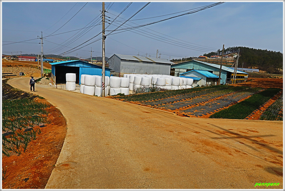 바닷가 갯벌에는 낚지산란장이 두 곳이나 보입니다. 바닷가 방조제로 이어지던 길은 잠시 후 북서쪽으로 방향을 바꿉니다. 양파밭과 축사를 지나자 혹독한 겨울추위를 견뎌낸 양배추를 수확하려고 큰 자루에 담아 놓은 모습이 매우 이채롭습니다. 넓은 밭의 군데군데 양배추를 담은 자루가 놓여 있는데 밭에는 여전히 양배추가 거의 그대로 있어 나중에 이것도 마저 수확할지 아니면 상태가 좋지 않아 버리는 것인지 잘 모르겠습니다.