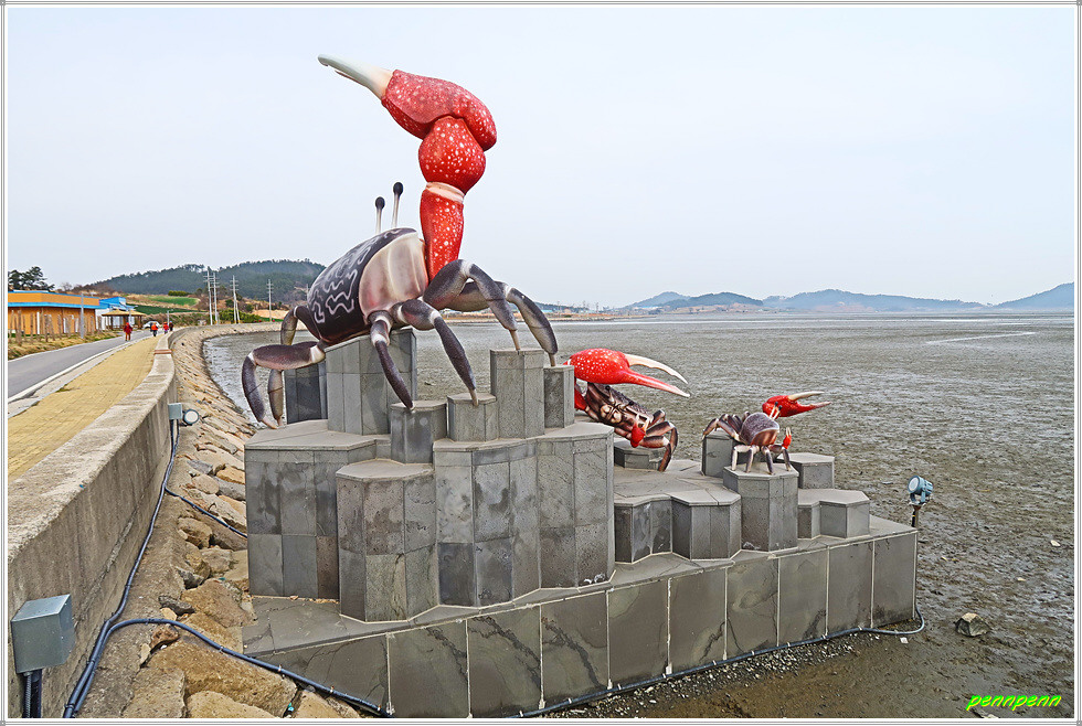 드디어 목적지인 신안젓갈타운입니다. 신안젓갈타운은 신안의 대표상품인 소금과 젓갈류를 구입할 수 있는 곳입니다. 여기서 남쪽으로 작은 섬이 하나 있는데 바로 거북섬입니다. 2021. 9월 신안군은 길이 430m, 폭 2.4m의 해상데크 길을 조성해 사람들은 거북섬을 안전하게 돌아볼 수 있게 되었습니다. 해상데크로드 입구에 조성된 거대한 농게 조형물은 방문객들에게 매우 인기입니다. 특히 수컷 농게는 한쪽의 집게다리가 매우 커서 좌우 비대칭인게 특징입니다. 거북섬에는 거북이 모형의 조형물과 거북이를 형상화한 액자틀이 있어 기념사진을 찍을 수 있습니다.