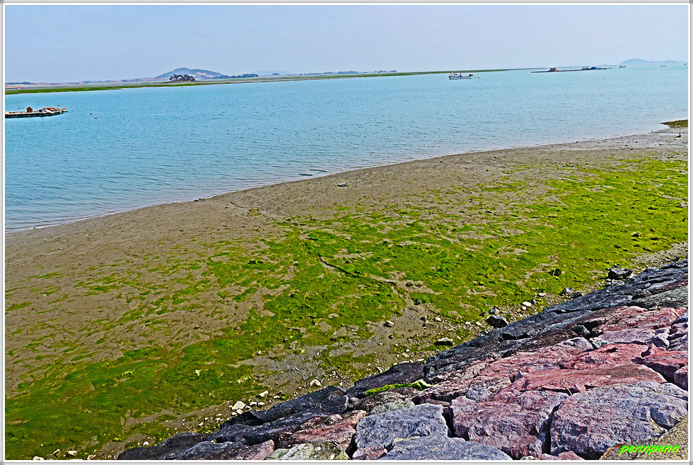 해뜰목 황토펜션민박을 지나 다시 바닷가 방조제를 만난 후 내륙으로 진입해 야트막한 고개를 넘어 갑니다. 바닷가에는 초록빛 식물인 감태가 무리를 지어 자라고 있군요. 무안이 끝나고 드디어 신안군 지도읍입니다. 이제 연륙교를 건너면 육지와 이어진 반도를 벗어나 섬인 신안군 지도에 다다릅니다.