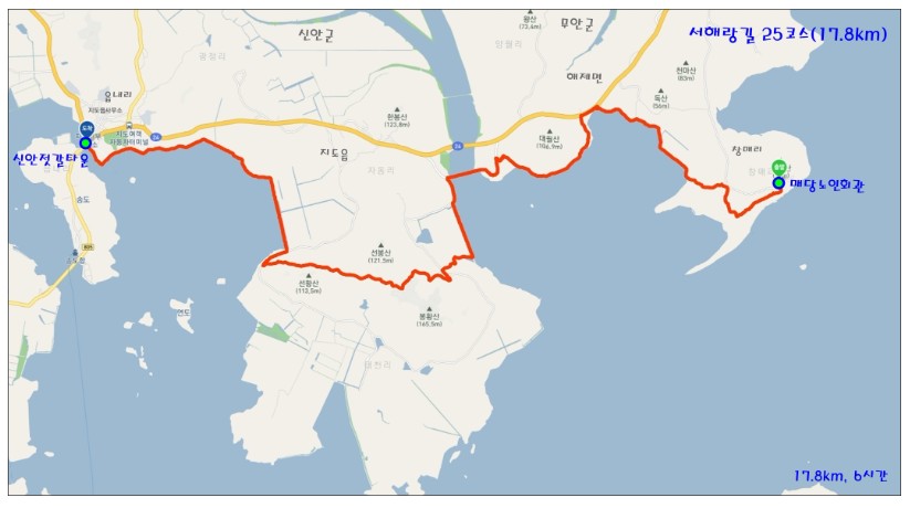 ▲ 코스 : 매당노인회관-매인경노당-창매리리조트-24번 국도(황토골휴게소매점)-연륙교-지도섬 임도(매봉재)-방조제-거북섬(왕복)-신안젓갈타운-송도교(지도읍보건지소)