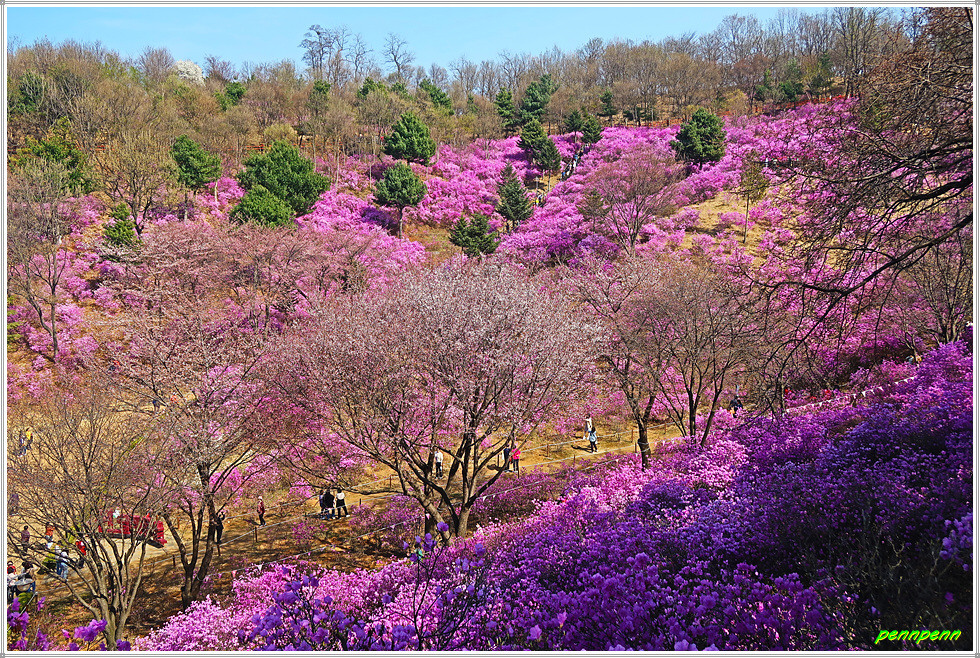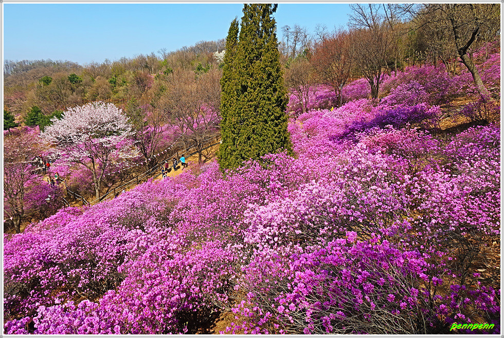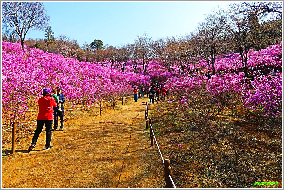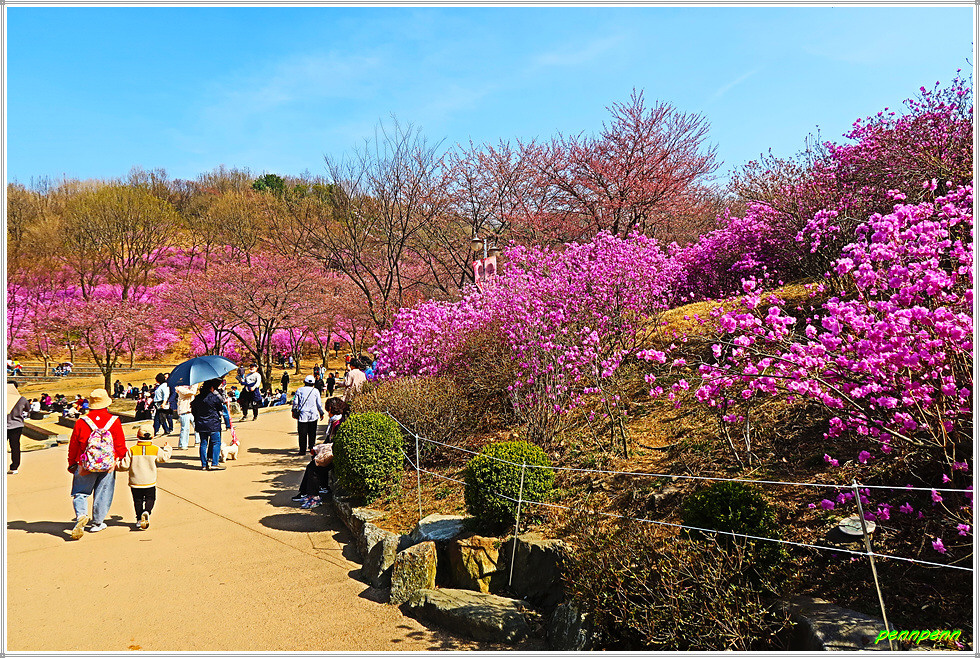 나무계단을 이용해 소월시비가 있는 쪽으로 내려갑니다. 기념사진을 찍는 사람들이 워낙 많아 풍경사진을 찍기도 쉽지 않습니다. 아마도 이번 주말에는 엄청난 인파가 몰릴 것 같군요. 원미산 진달래동산은 수도권에서 편리하게 멋진 진달래군락을 감상할 수 있는 손꼽히는 진달래명소입니다.(2023. 3. 30)