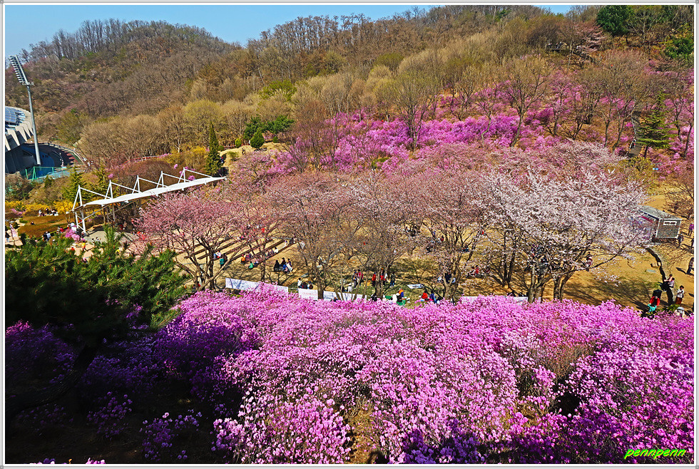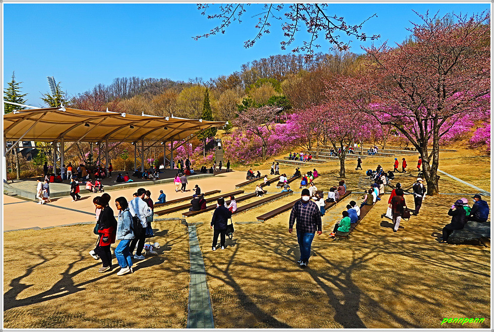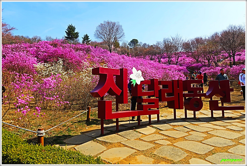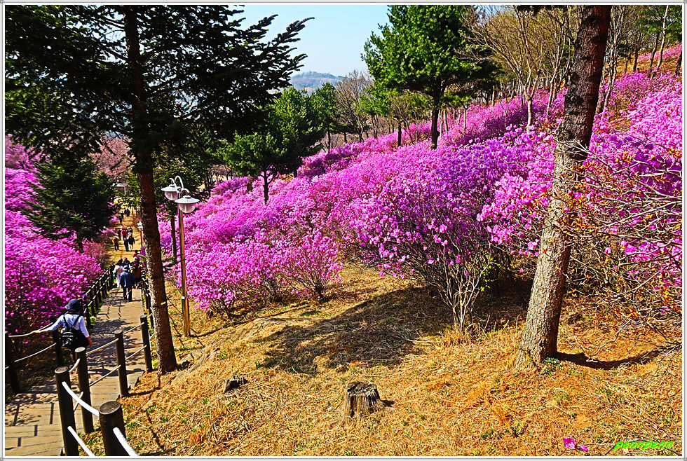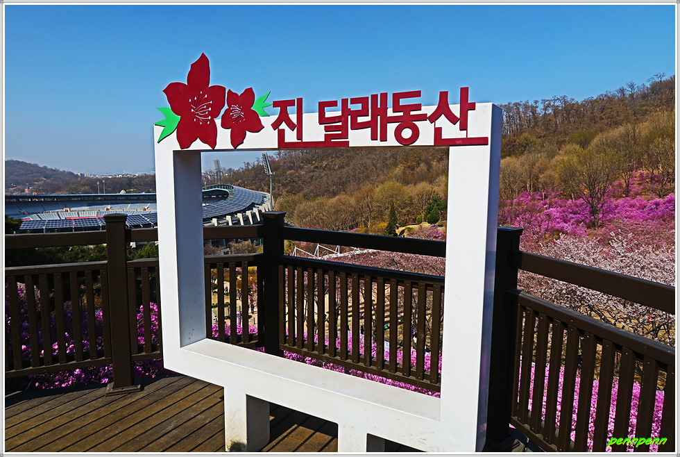 능선을 따라 가노라면 우측에 또 다른 조망대가 있는데 진달래동산이라는 글씨가 붙어 있는 사각액자틀이 있습니다. 이곳에 서면 골짜기 맞은편 산비탈의 진달래가 한눈에 들어오지요. 아래쪽으로는 야외공연장이 내려다보입니다.