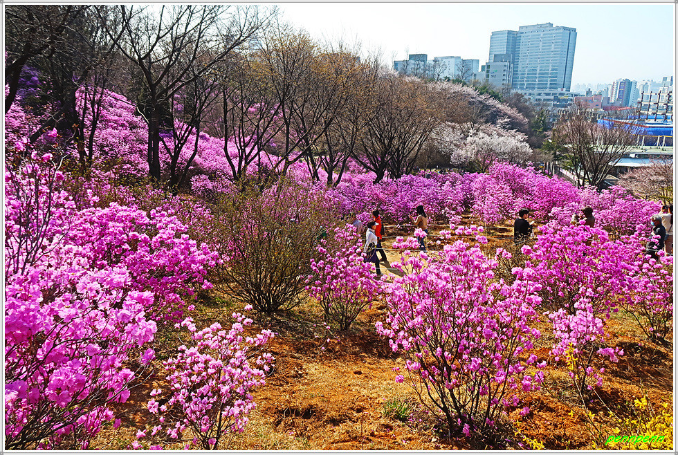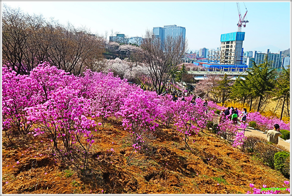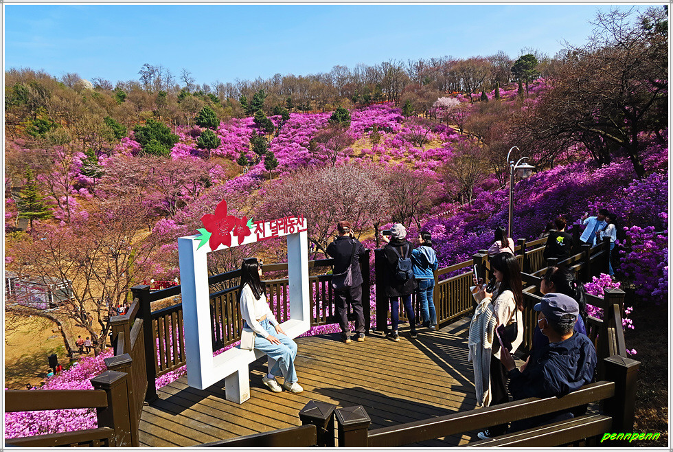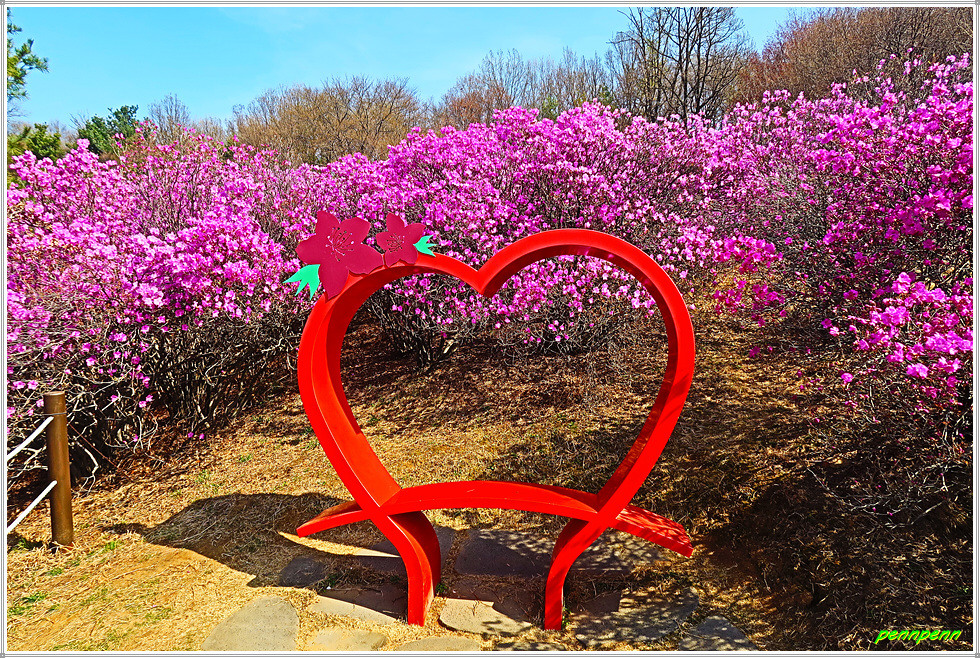진달래동산 입체글씨에서 우측으로 오릅니다. 오르막 초입에 좌측으로 난 사잇길을 조금 가면 사진촬영 포인트인 하트조형물이 숨어 있습니다. 다시 위쪽으로 올라 넓은 등산로를 만나 좌측으로 조금 가면 진달래동산 광장으로 내려가는 길이 보이는데 이쪽에서도 진달래군락을 볼 수 있습니다.