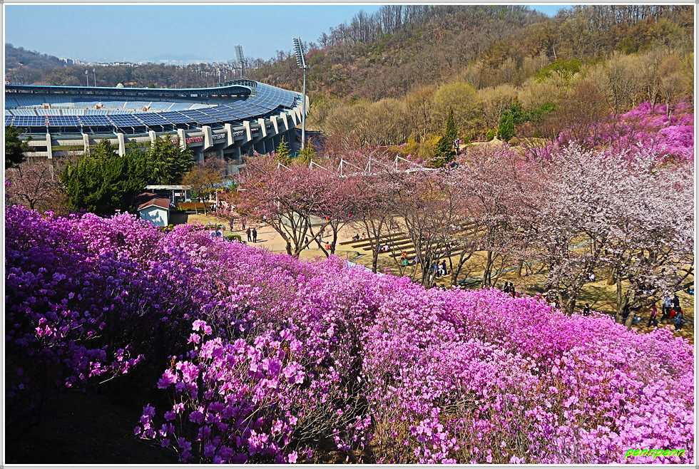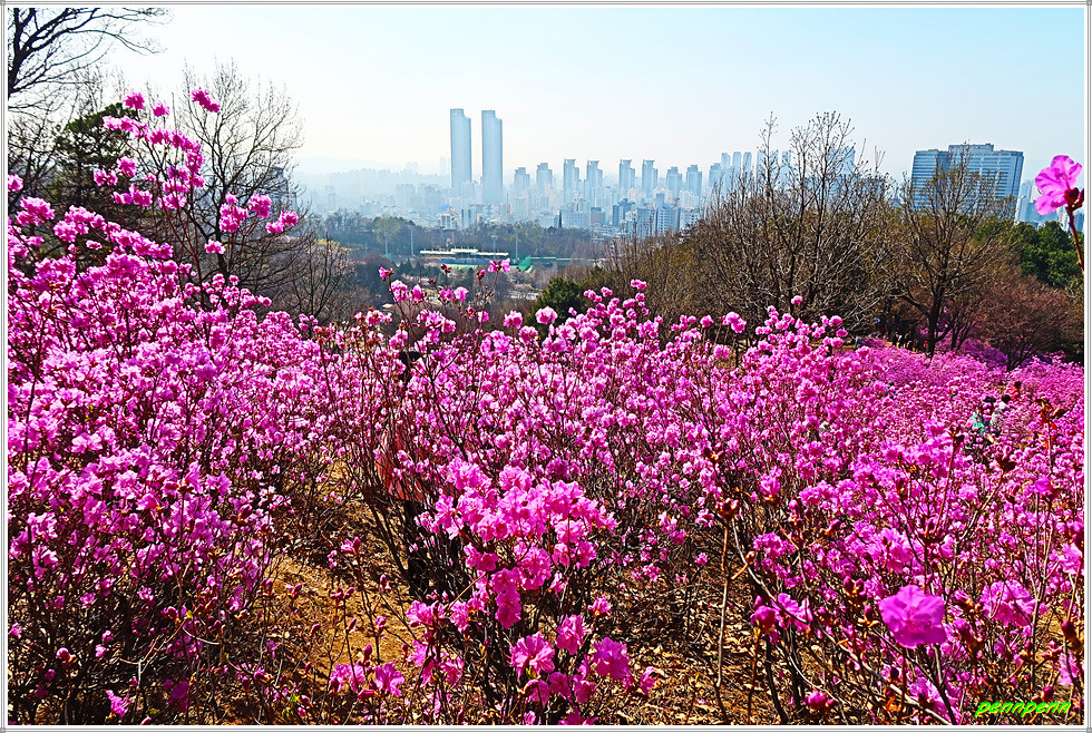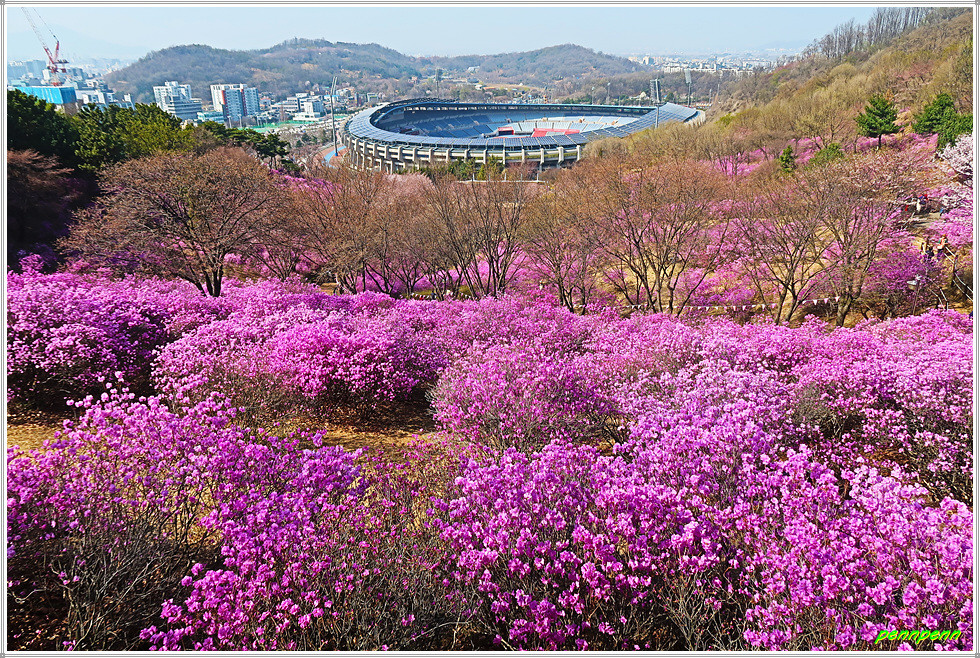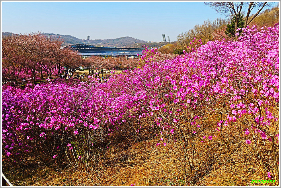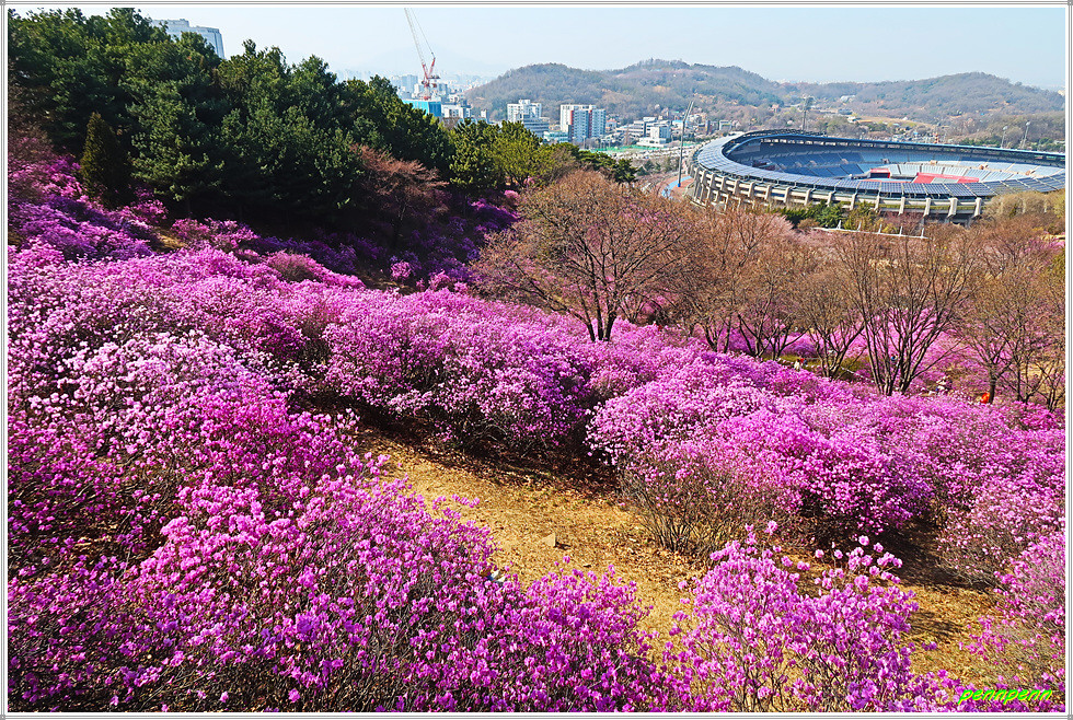 서울지하철 7호선 부천종합운동장역 2번 출구로 나와 좌측에 있는 부천종합운동장과 부천활박물관을 지나면 진달래동산 입구인데 진입로에서부터 화사한 진달래가 피어 있어 감탄을 하게 됩니다.