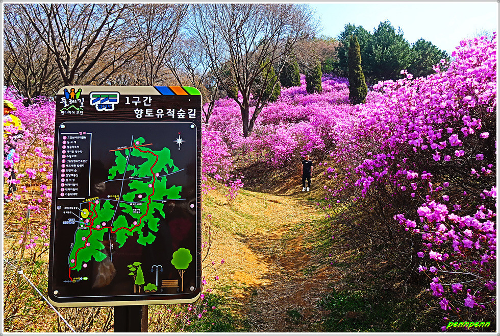 갈림길에서 어느 쪽으로 가도 되지만 소월시비가 있는 곳에서 좌측으로 진입합니다. 부천둘레길 1구간(향토유적숲길)을 알리는 안내지도가 세워져 있군요. 산비탈에 피어 있는 진달래를 감상하면서 안으로 들어가면 야외공연장이 있는 넓은 광장이 나오고 광장 안쪽에는 진달래광장을 알리는 입체글씨가 놓여 있습니다.