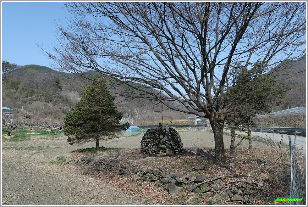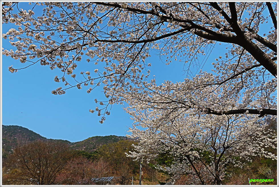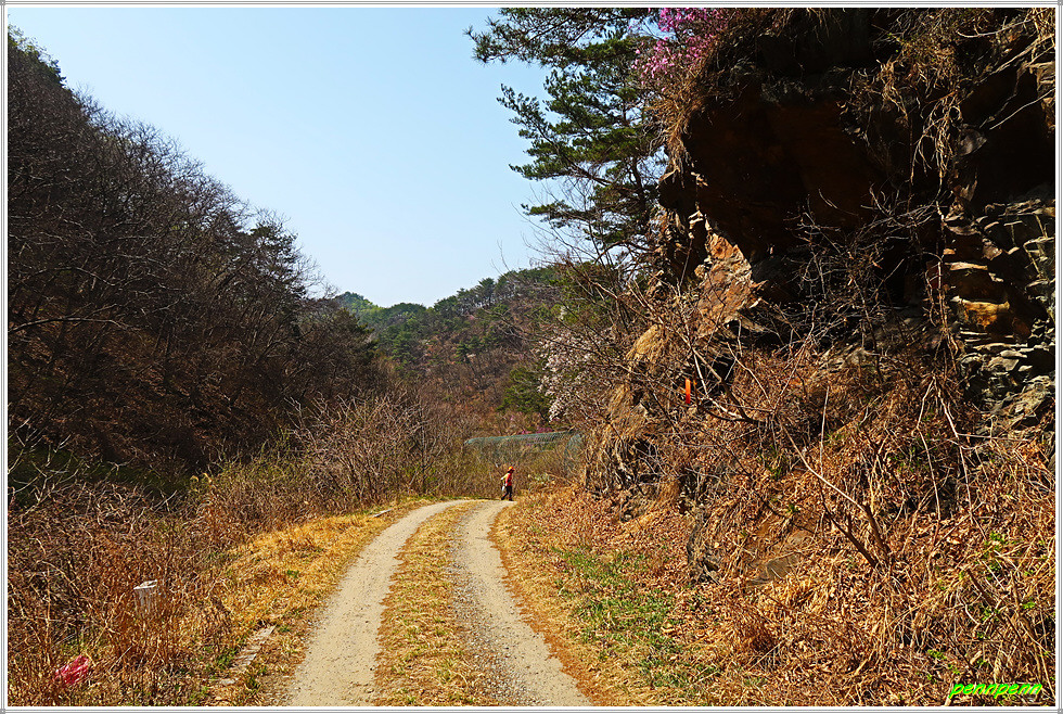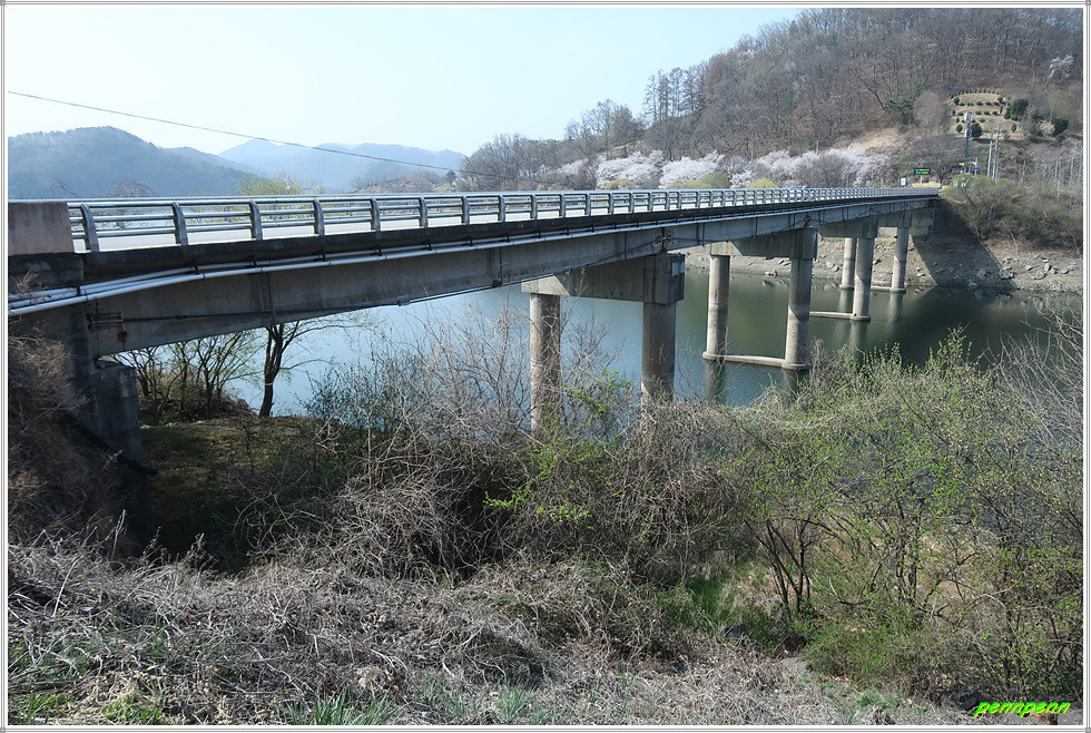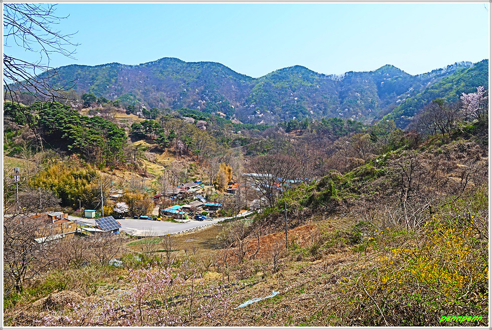 벌랏한지마을을 뒤로하고 차도를 따라 마을 위쪽을 거쳐 서쪽으로 이동합니다. 이제부터 목직지까지는 청주 마을버스가 다니는 길이어서 고개를 하나 넘어야하지만 어렵지는 않습니다. 길을 가면서 한지마을 뒤쪽을 바라보니 아까 이름 모를 봉우리를 넘으며 고생했던 산의 능선이 아무 일도 없었던 것처럼 완만하게 보일 뿐입니다. 벌랏고개의 벌랏한지마을 안내도는 전혀 관리가 안 되어 오물이 묻은 채로 방치되어 있습니다. 지나는 길목에는 벚꽃과 함께 복사꽃(복숭아꽃)도 탐스럽게 피어 있고 나무들도 물이 오른 모습입니다.