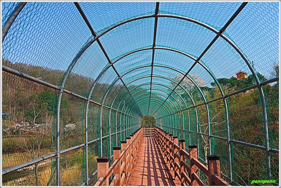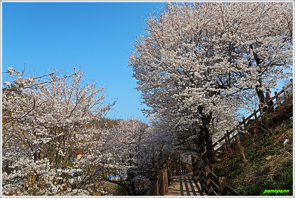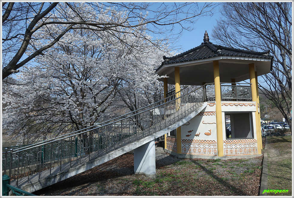 이곳 거교2리마을에는 소박한 벽화가 그려져 있고 회남우체국도 있습니다. 마을 중심부를 빠져 나가는 길목에 엄청난 거목이 한 그루 보이는데 꽃의 색상으로 봐서 벚꽃나무같지만 이처럼 큰 벚꽃나무가 있는지 미처 몰라 확신이 서지는 않습니다. 밑으로 내려서니 회인천변의 나무데크를 만나게 되고 테크길은 회인천의 물굽이를 돌아 571번 지방도로로 이어집니다.