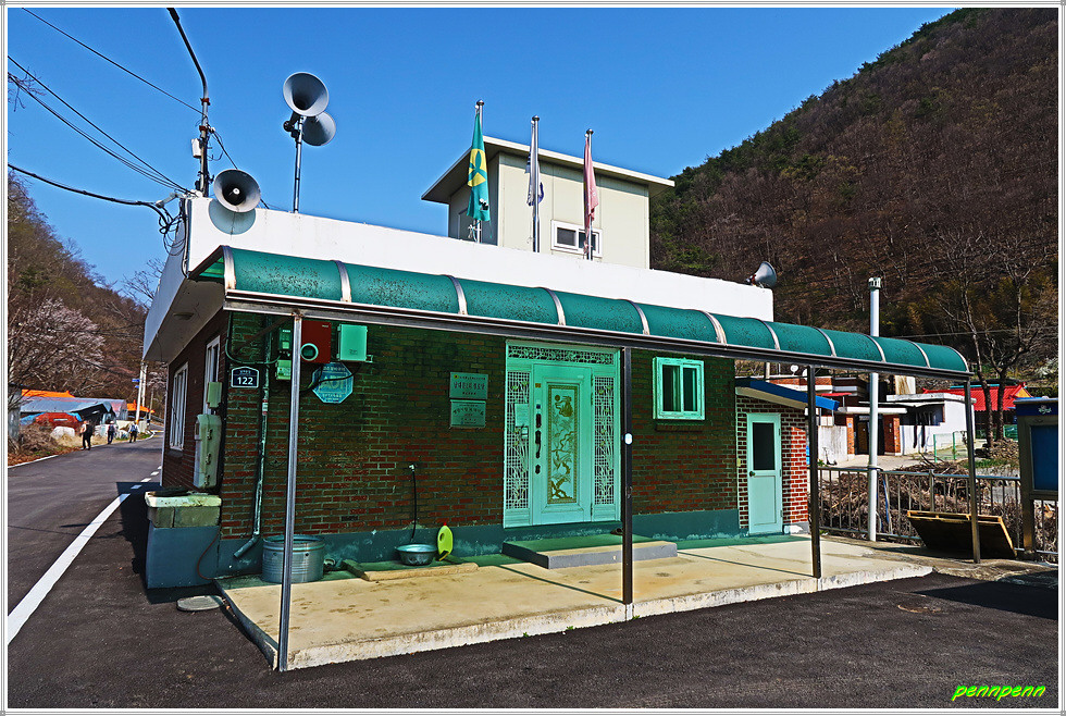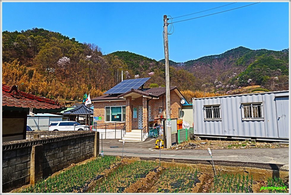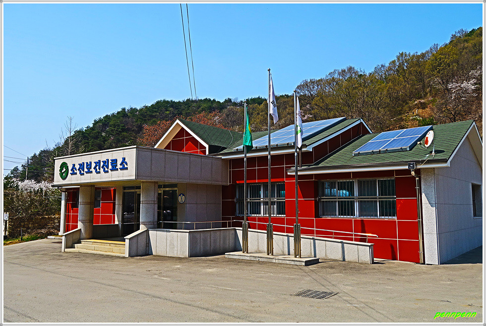 고갯마루를 넘어가는 데 명자나무가 강렬한 붉은 꽃을 피우고 있습니다. 이 꽃을 볼 때마다 가왕 나훈아가 3년 전 발표한 “명자야”란 노래가 떠오릅니다. 나훈아의 특유한 목소리로 “자야, 자야, 명자야! 불러샀던 아버지, 술 심부름에 이골났었고~”를 부르짖을 때 고향의 부모님(생사불문)이 생각나는 것은 필자만은 아니겠지요. 포도나무 과수원과 소전2리 경로당을 지나면 목적지인 소전보건진료소입니다.