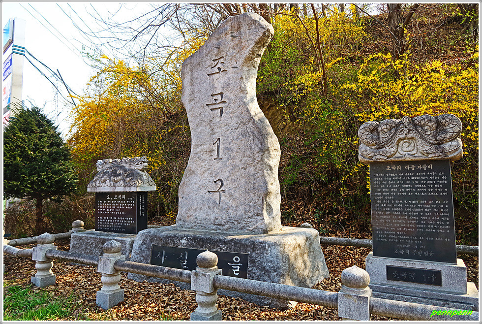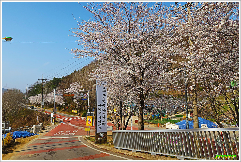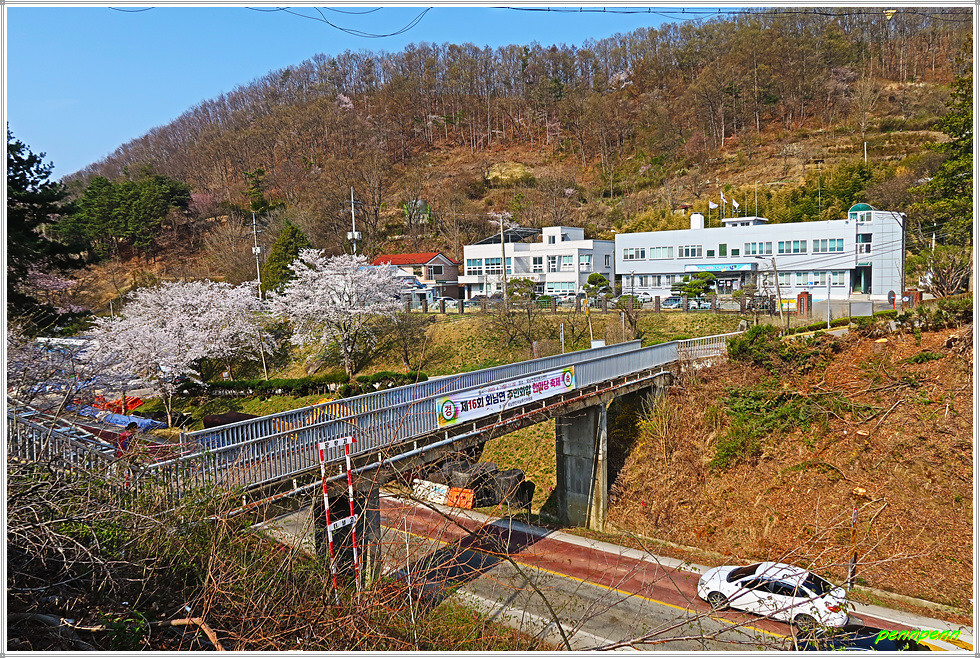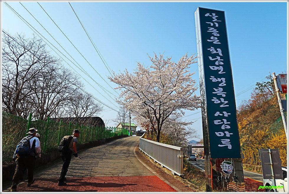 16구간의 들머리는 충북 보은군 회남면 거교리 거신교 삼거리입니다. 이곳에는 조곡리 마을 자랑비와 사실마을 버스정류소가 있습니다. 회남면사무소는 여기서 거신교를 건너면 도로 우측 언덕에 자라잡고 있지요. 그런데 이방인을 반갑게 맞아주는 것은 도로변에 활짝 피어 있는 벚꽃입니다. 금년은 벚꽃의 개화시기가 예년에 비해 약 10일정도 빠르다고 하더군요.