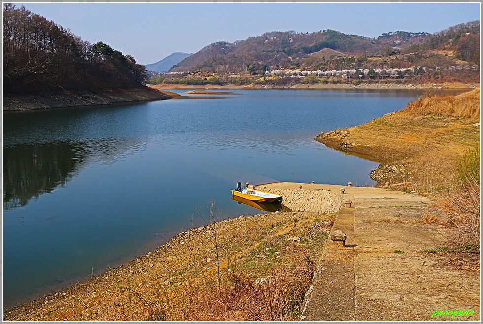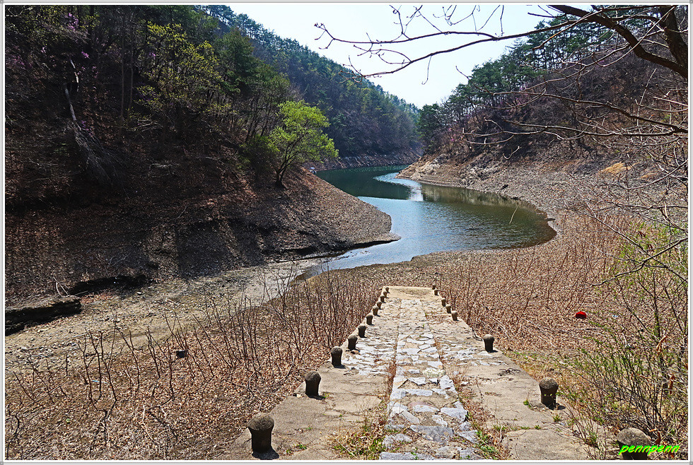 정자가 있는 벌랏에서 벌랏 선착장까지의 거리는 500m(이정표)로 이곳에 가면 조망이 좋다는 말을 듣고는 일행과 함께 선착장으로 갑니다. 잠시 후 선착장에 도착했는데 대청호 지류가 흐르는 곳이어서 기대했던 것만큼의 조망은 아니었습니다. 거리도 편도 500m가 아니라 왕복 500m로 상당히 짧은 게 다행입니다.