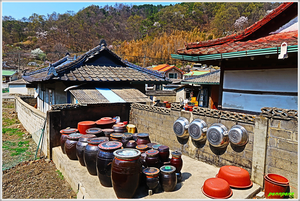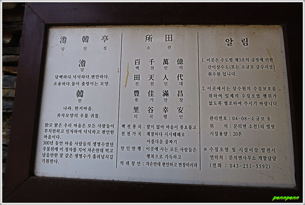 경로당 옆에는 2층 누각이 있고 그 안쪽에는 샘터가 보이네요. 현지 안내문을 보니 300여년간 마을 사람들의 생명수였던 우물 위에 정자 담한정을 지어 자손만대 먹고 남을 만한 꿀 같은 생명수가 흘러넘치길 기원하고 있습니다.