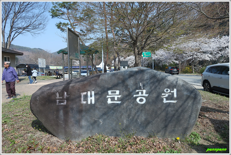 도로를 따라 걸어가면 좌측 언덕에 회남면 수몰유래비가 세워져 있고 이를 넘어가면 정자가 있는 곳은 바로 남대문소공원입니다. 이곳은 대청호 오백리길 6구간(대추나무길)의 종점이어서 기억이 새롭습니다. 좌측에는 남대문교가 있지만 우리는 직진합니다. 도로변에는 이 고장에서 자주 보는 제신탑(원탑)도 보이고 장독대가 많은 가옥도 있습니다.