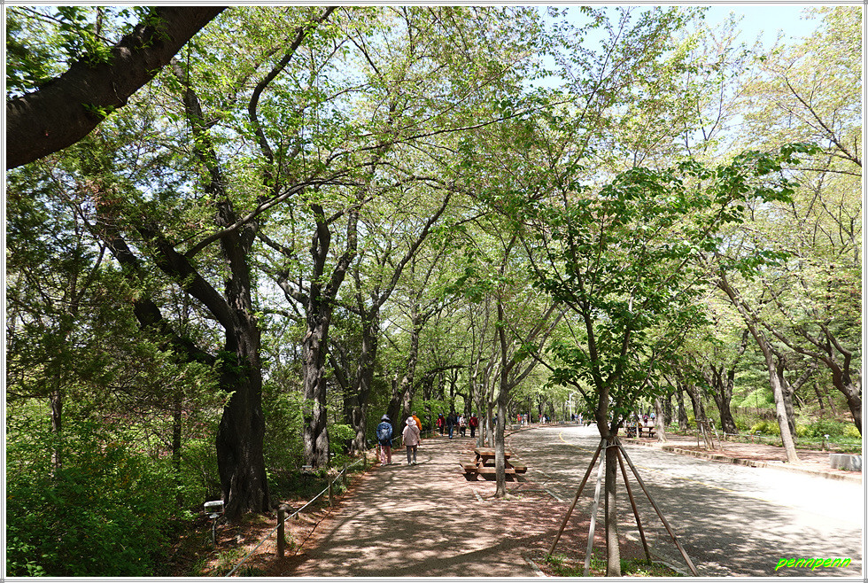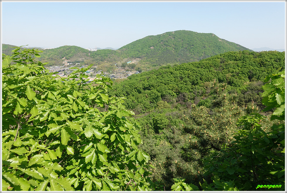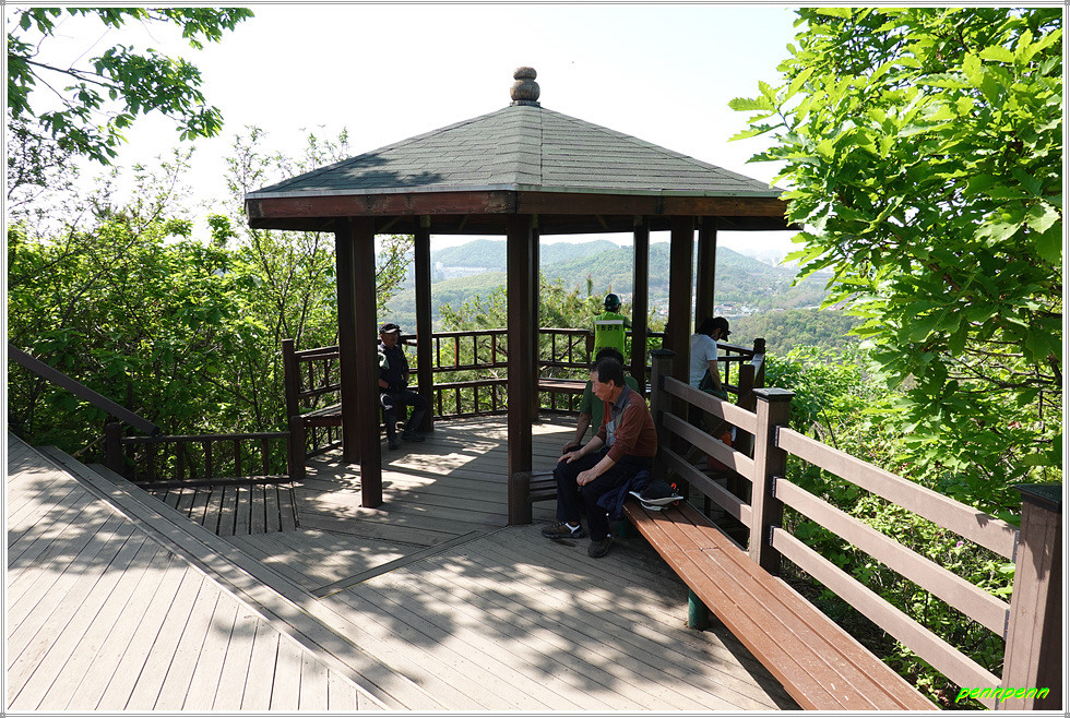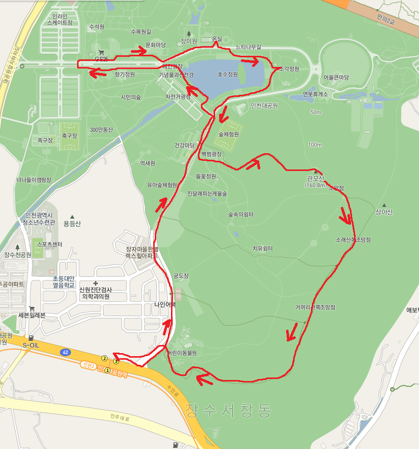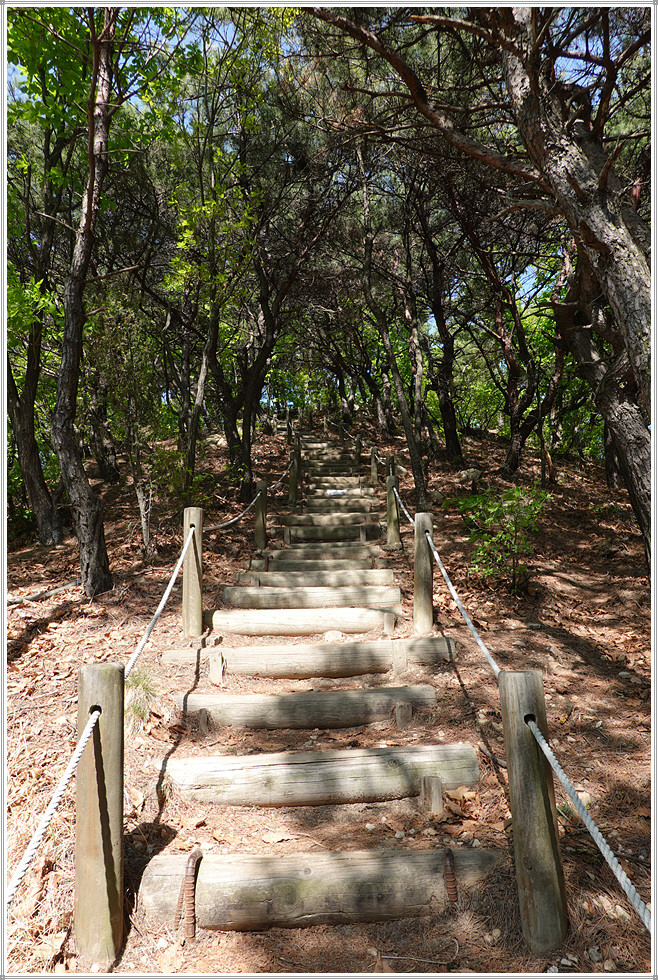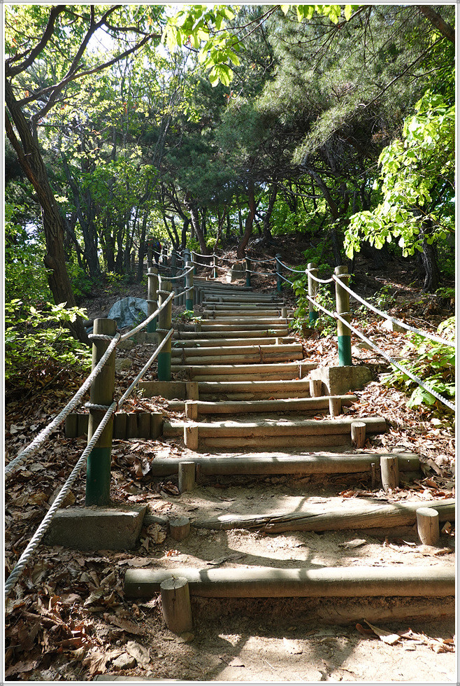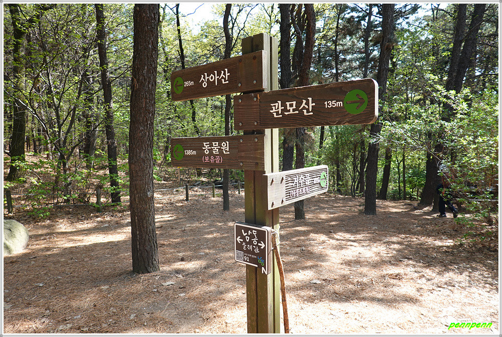 정상에서 동남쪽으로 하산합니다. 아까 오른 길보다 훨씬 급경사에 계단이 설치되어 있군요. 안부로 내려와 상아산과 동물원 방면으로 갑니다. 이어지는 길은 매우 편안한데 돌무더기에서 동물원 이정표를 따릅니다. 상아산 갈림길에서 우측인 남쪽으로 가면서 쉼터와 통나무계단을 통과하면 어린이동물원입니다. 여기서 대공원 남문을 거쳐 인천대공원역에 도착해 답사와 산행을 마무리합니다.