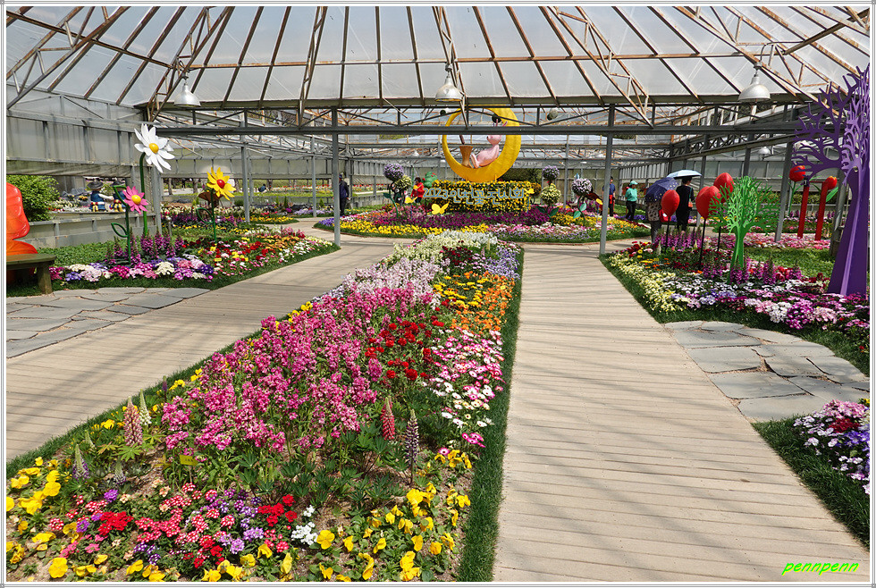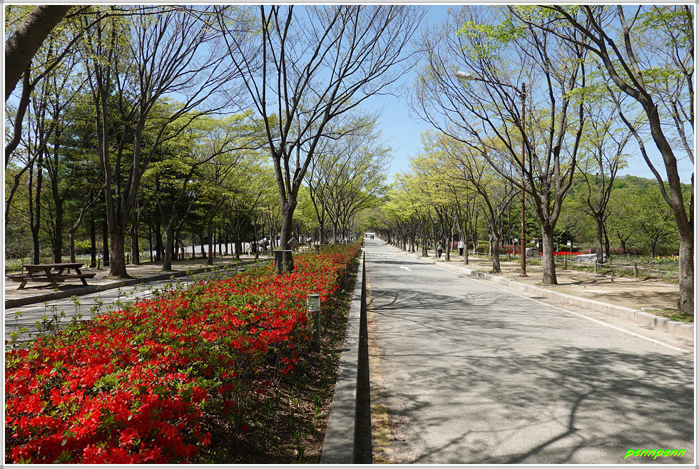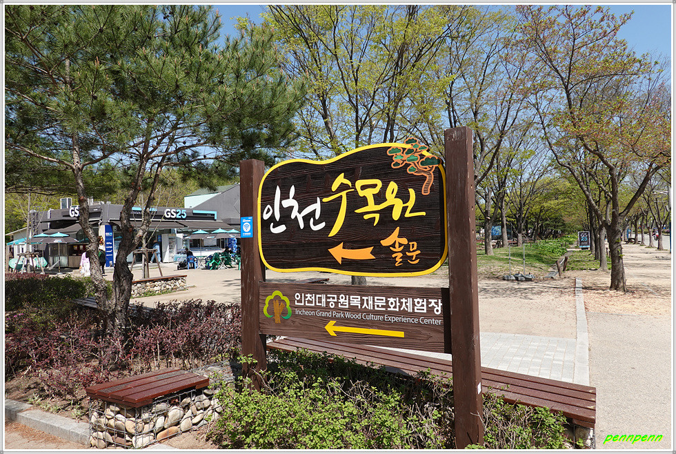애인광장에서 서쪽 정문방면으로 갑니다. 대로 좌측의 향기정원에는 튤립화단이 조성되어 있고 그 옆에는 2023 인천꽃전시회(2023. 4. 7-4. 23)가 열리고 있습니다. 꽃전시회는 전시장 내부에 팬지, 마가렛, 비올라 등 여러 종류의 봄꽃 1만포기를 심었고, 보름달 토끼, 버섯, 나비, 하트 등 13종의 다양한 조형물로 포토존과 스토리를 표현한 것이 특징입니다.