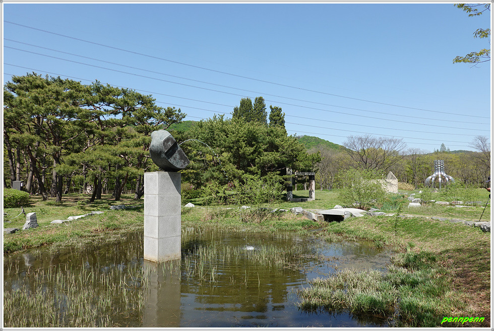 온실을 나와 동쪽으로 계속 가면 호수정원 북동쪽에 공원에서 가장 넓은 튤립화단이 조성되어 있습니다. 이쪽에서는 잠시 후 올라야 할 관모산이 우뚝하네요. 호수공원 동쪽에 있는 조각정원은 마치 서울올림픽공원의 조각작품들을 보는 것 같습니다.