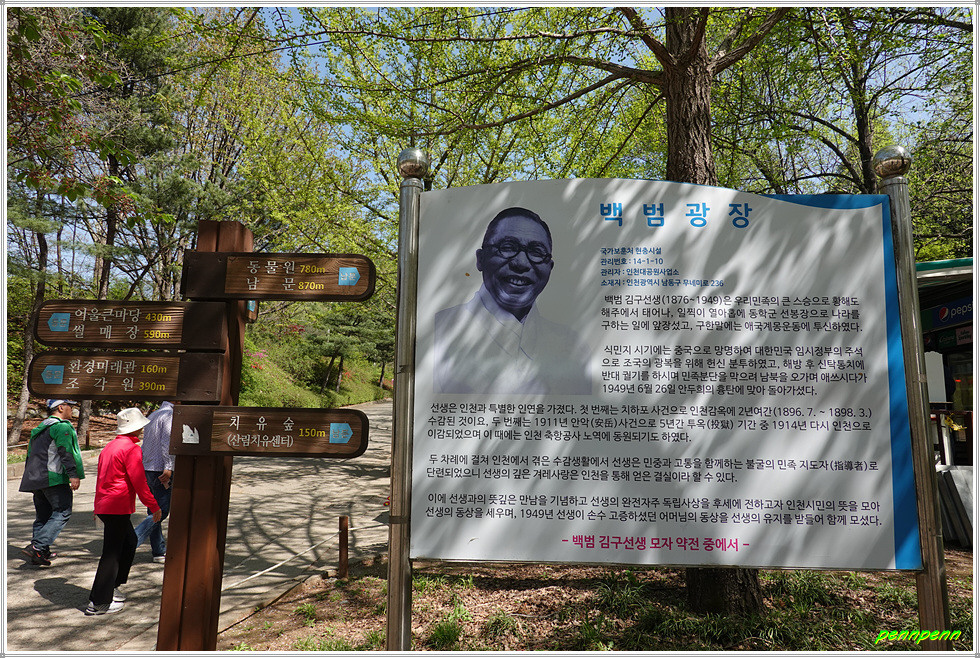조각정원에서 환경미래관을 거쳐 남문 쪽으로 갑니다. 백범광장 입구 옆에 관모산 숲길 안내도가 있는데, 관모산(162m)은 인천대공원을 대표하는 산으로 산의 모양이 관(冠)을 쓴 형상이어서 지어진 이름입니다. 여기가 바로 관모산 등산로 입구인데, 정상까지 630개의 계단을 올라야한다는군요.